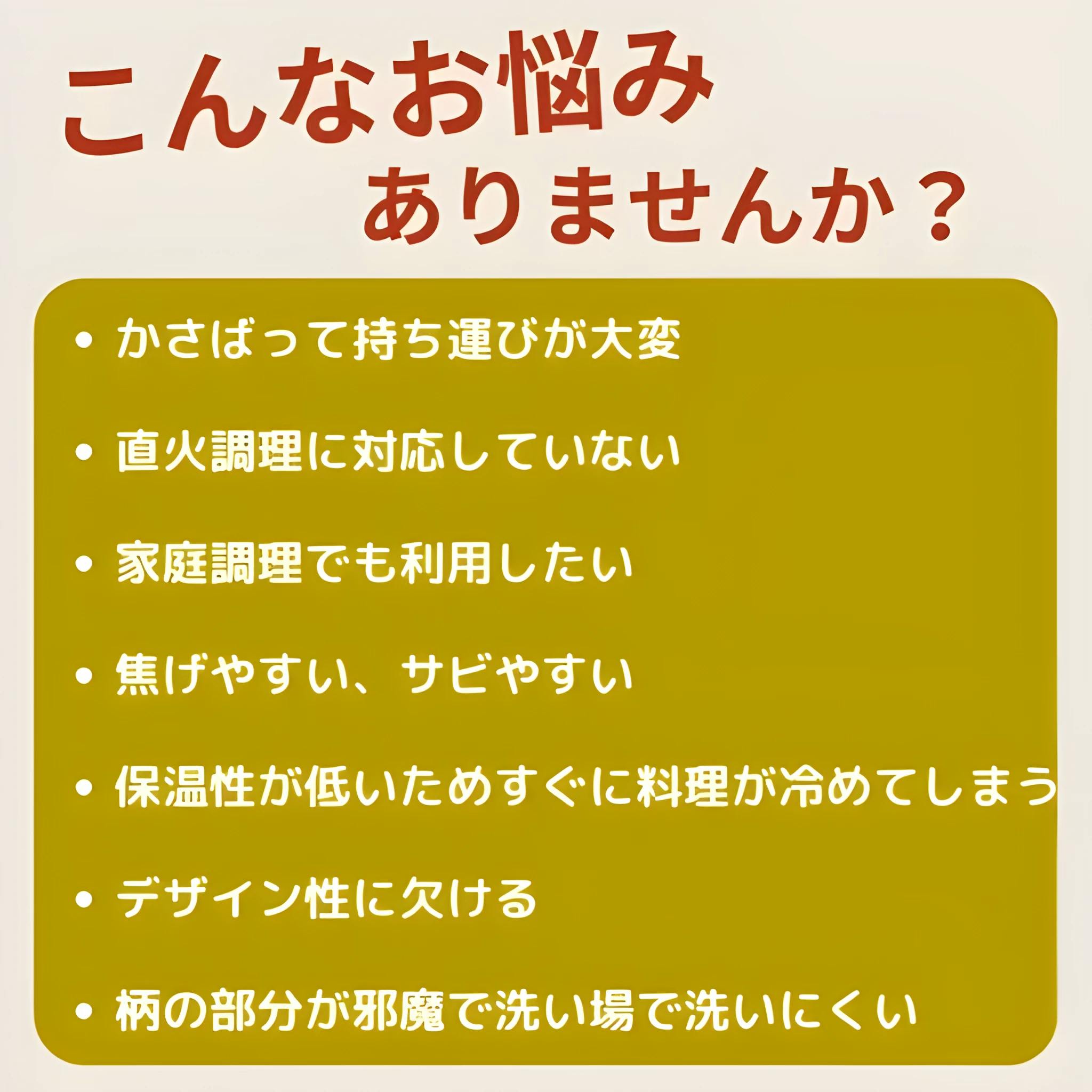 1. IH、ガス、オーブンや焚火など、様々な用途にお使い頂けます。