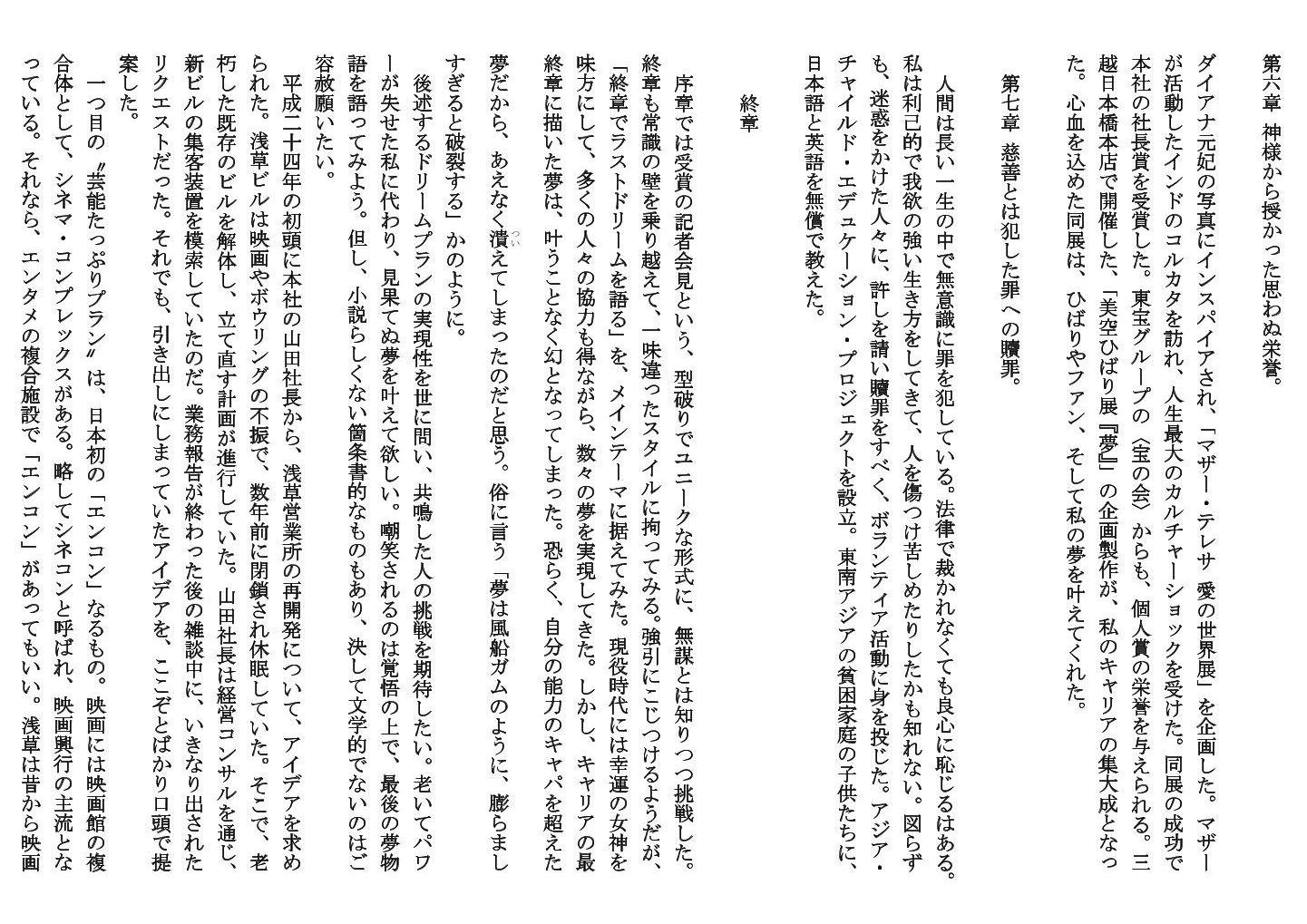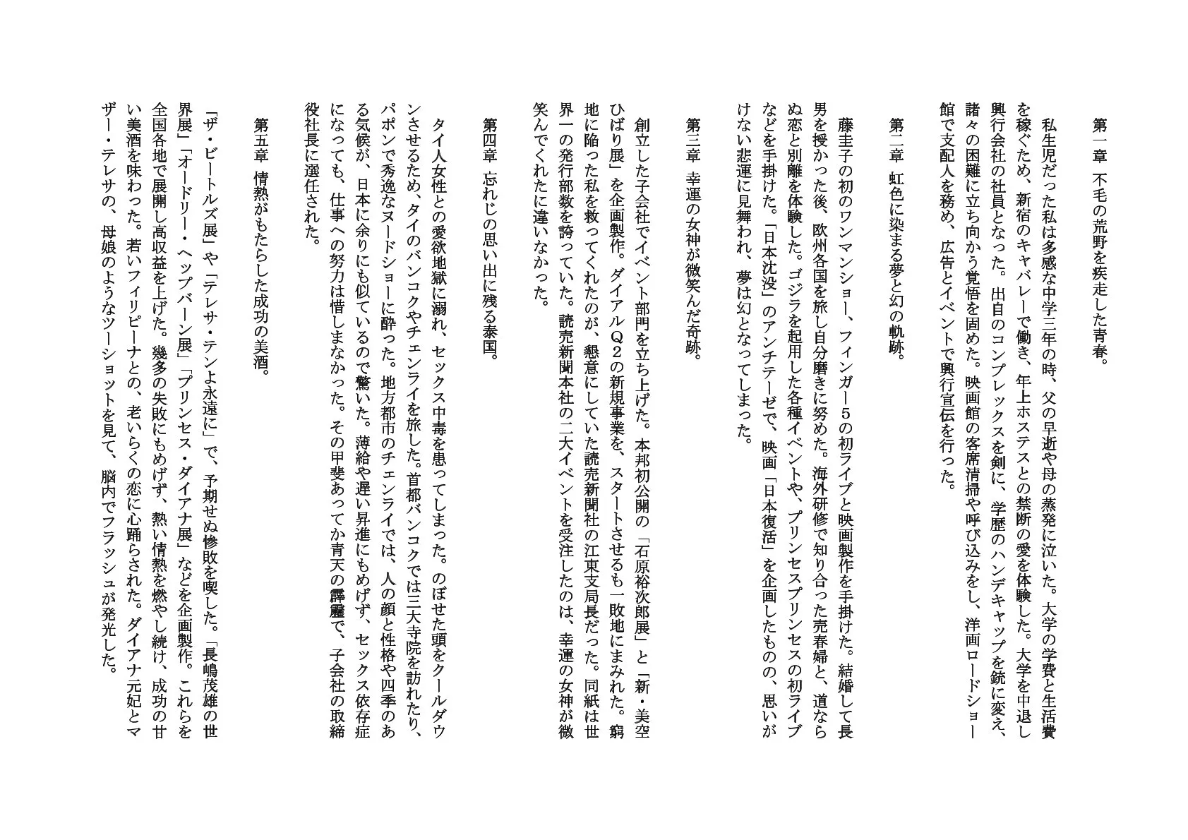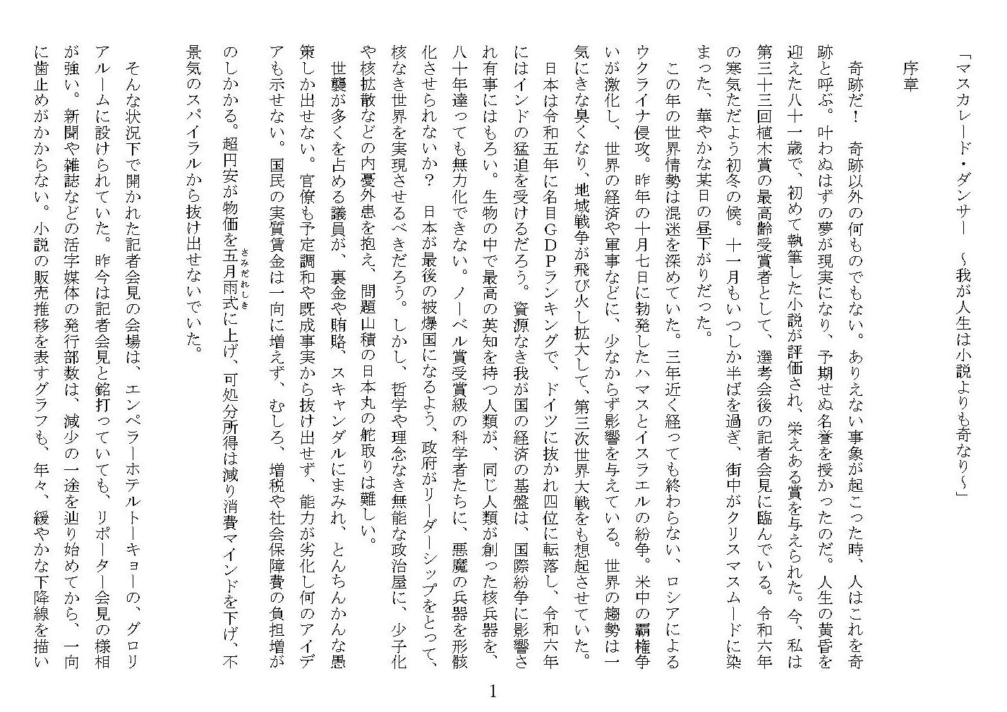 劇的な人生をあからさまに綴った小説をさらしめ、私の生き様を世に問うプロジェクトに、貴方も協力者として関わってみませんか? 81歳にして夢の実現に挑む最後の冒険に、貴方の厚いご支援を心からお待ちしております。ご支援いただけることで、作品が多くの人々の心に刺さればと思っています。支援者様が当てて下さる光りで、このプロジェクトを成功させて、その輝きを共有できれば幸いです。なお、どんな小説かを知っていただくため、序章のフルバージョンと、第一章から第七章、終章のダイジェストを、下記に添付しました。お暇な折にご高覧ください。なお、文字の画像が小さいので、デバイスの環境によっては、読みづらくなる可能性があります。その際はご一報ください。元原をメールでお送りします。