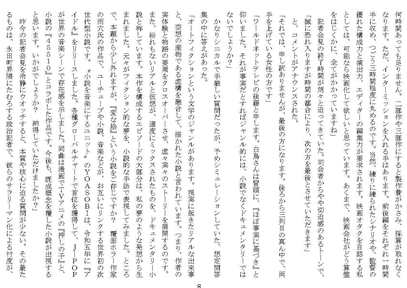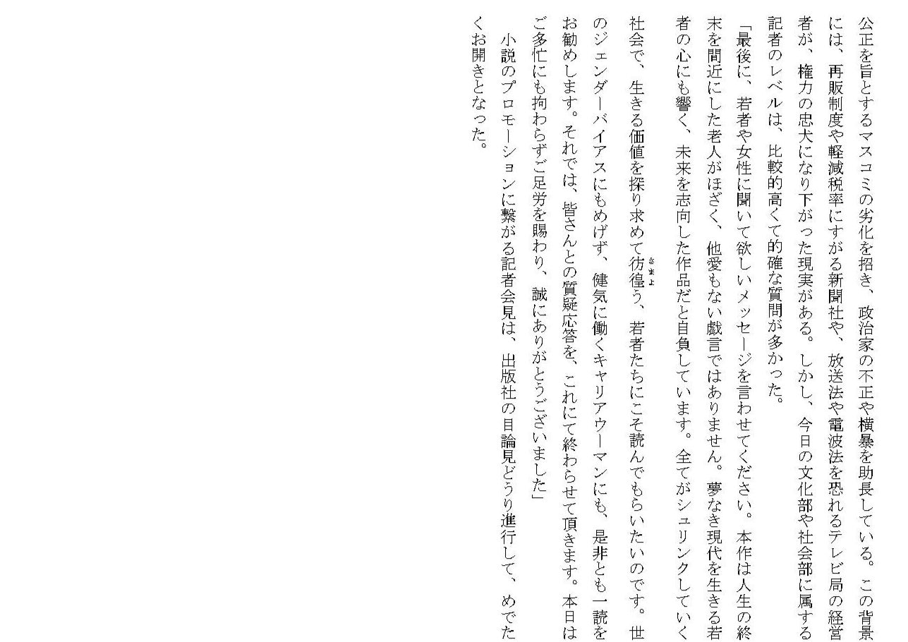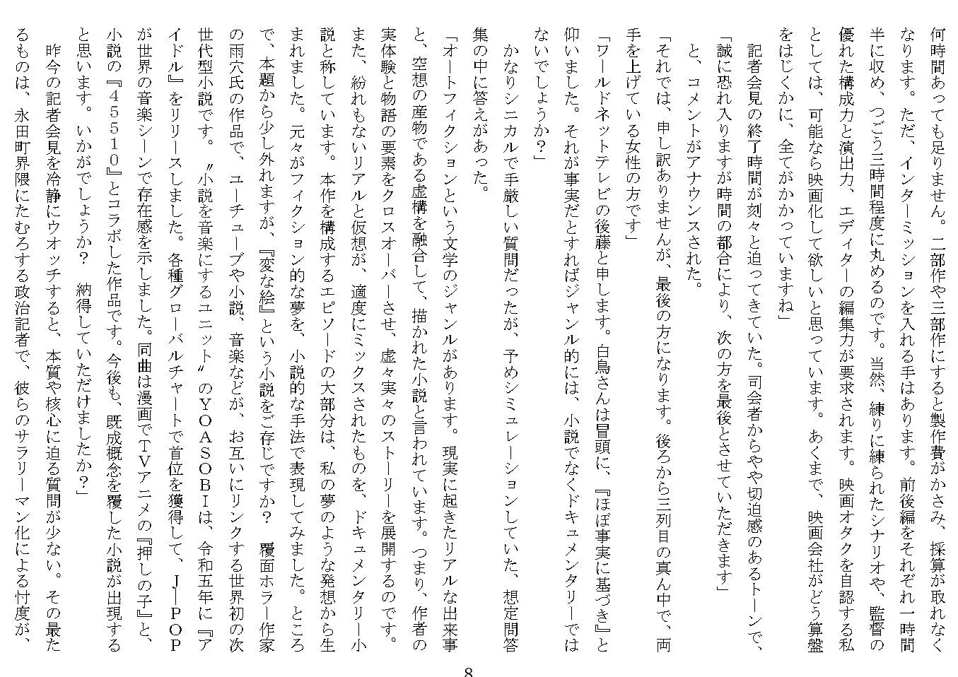 小説の草稿はすでに完成しており、現在は校正作業と出版に向けた準備を進めています。SNSで発信するコンテンツの、プラニングと制作作業も終わっています。出版社との交渉も大詰めを迎えており、プロジェクトの実現に向けて猛進しています。