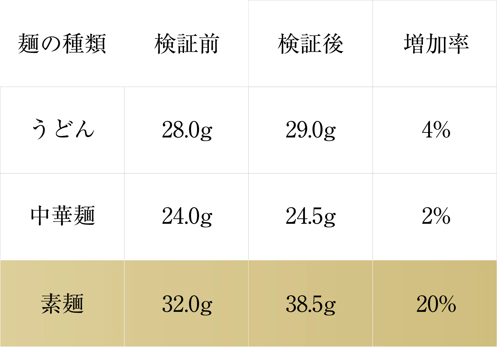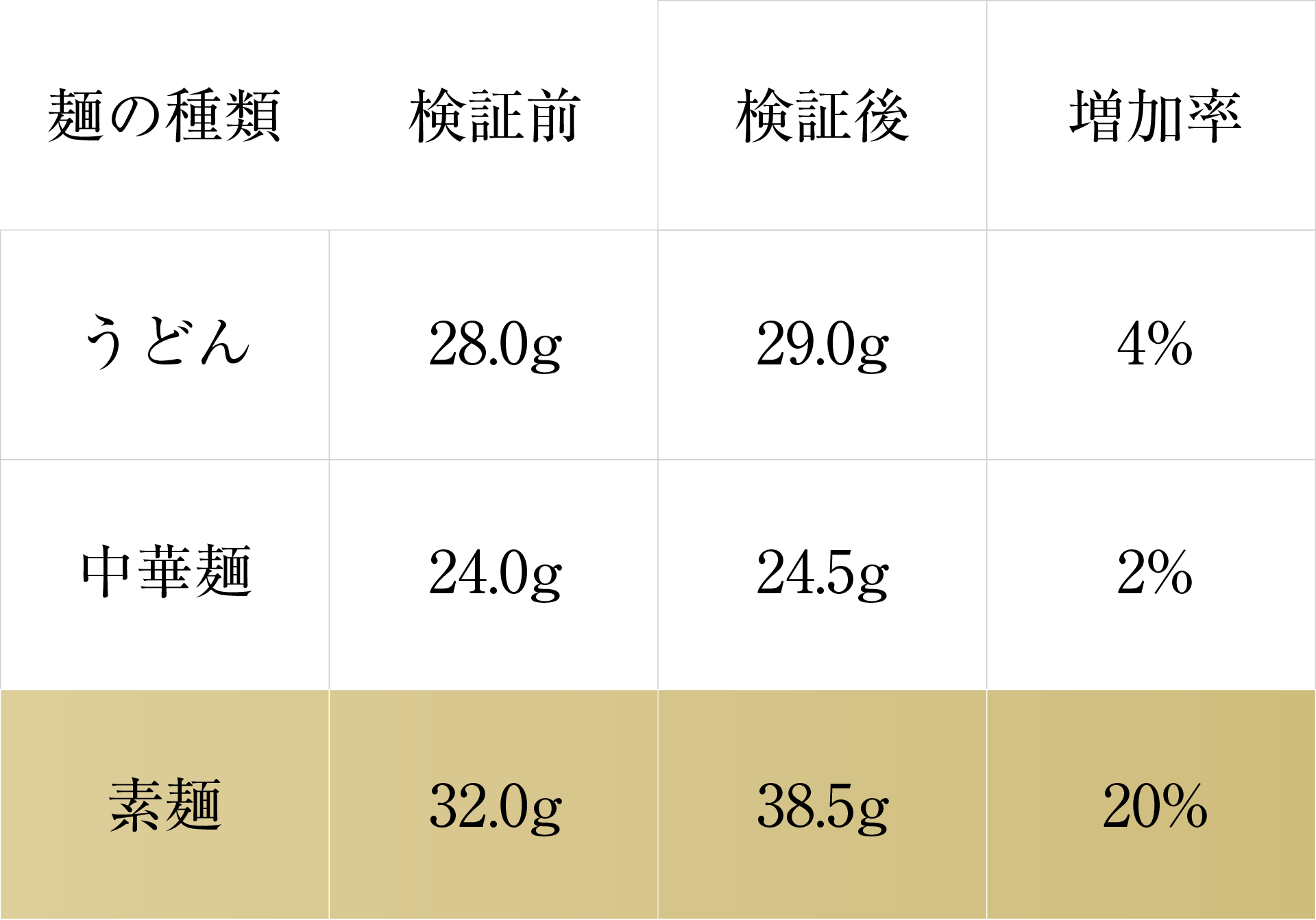 ③増加率が大きい麺ほどスープに絡みやすいと仮定弊社で扱う「うどん」「中華麺」「素麺」で比べてみたところ、すくい上げた時にスープが絡む量が最も多いのは「素麺」でした。