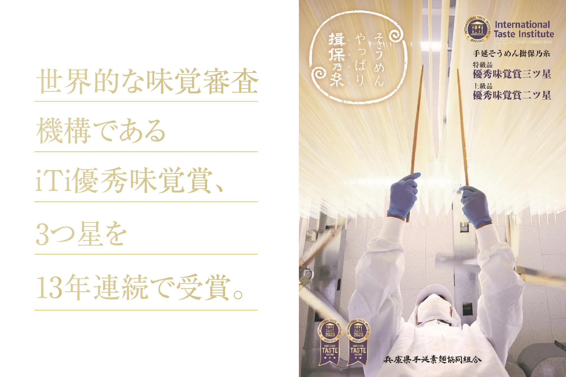 特級品は、世界的な味覚審査機構であるiTi優秀味覚賞において、極めて優秀とされる3ツ星を13年連続で受賞した、揖保乃糸の扱う等級の中でもトップクラスの商品です。