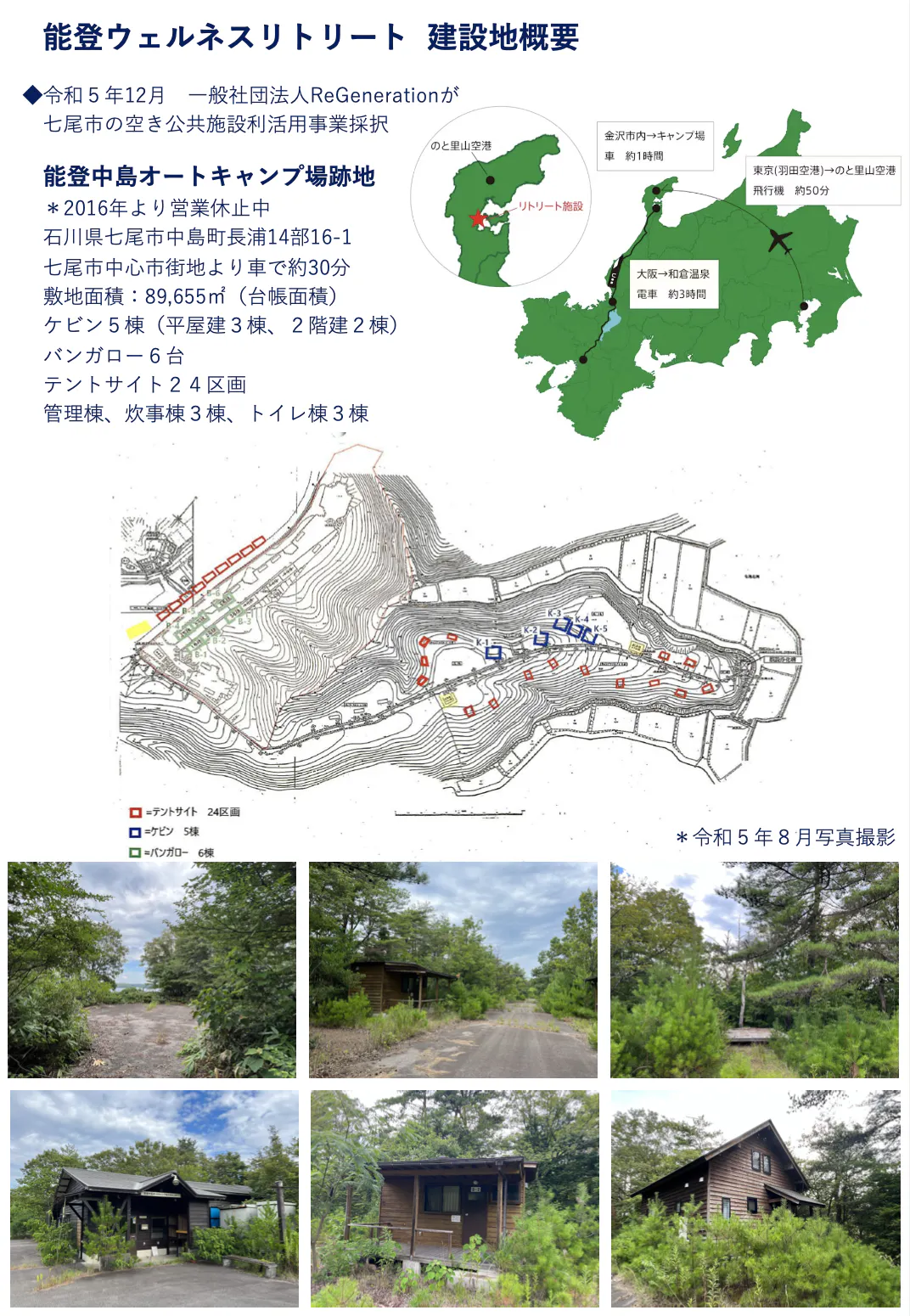 そこで、私たち一般社団法人 ReGeneretionは、七尾市中島のオートキャンプ場の跡地をボランティアの宿泊施設として再生し、喫緊の課題を解決します。