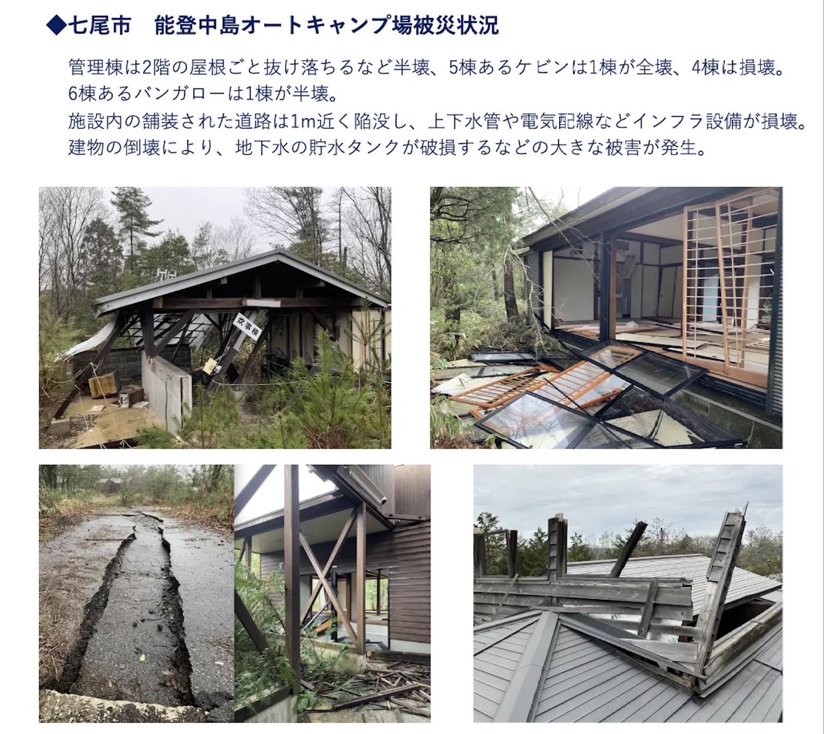 * 施設のインフラ設備の補修費用: 上下水道、電気設備など損壊したインフラの簡易的な補修を行い、早期の宿泊施設開業を目指します。