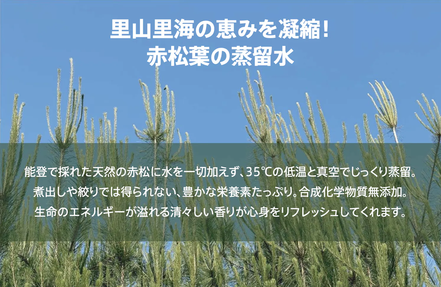 【赤松の葉蒸留水コース】能登の天然赤松の葉を水を加えず35℃の低温真空で蒸留したナチュラル蒸留水。