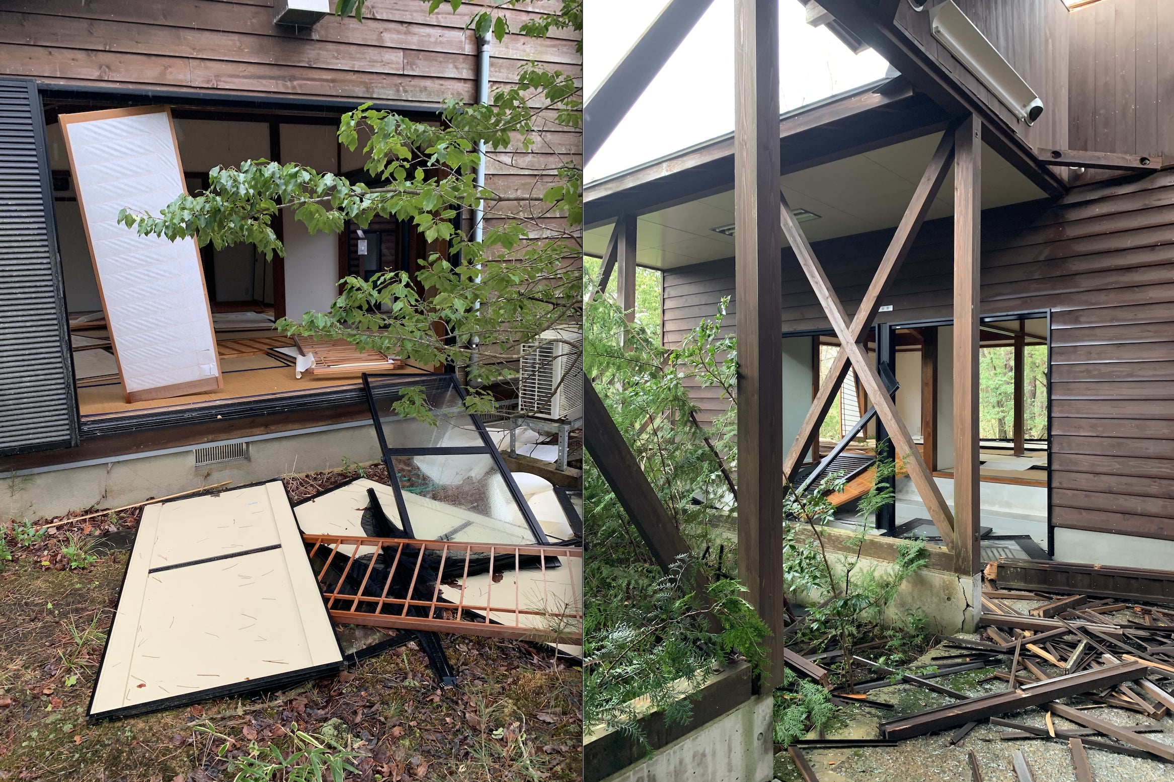 (左)窓ガラスや雨戸などが損壊し使用できない状態