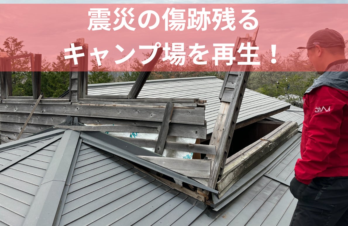 地震から数ヶ月経った今も、キャンプ場には倒壊した管理棟や散乱した瓦礫が残っており、震災の爪痕を深く感じさせます。