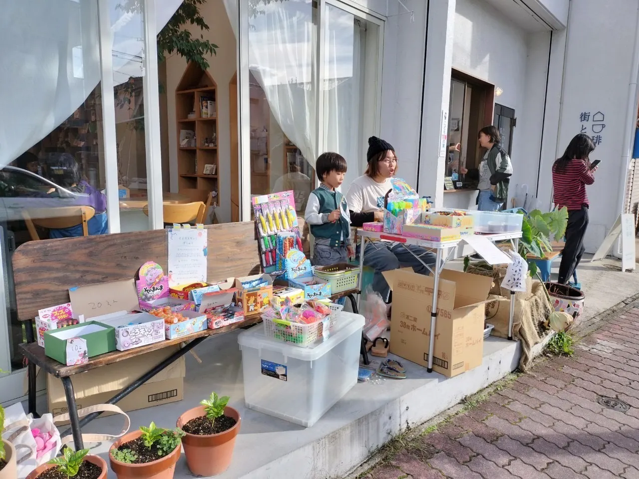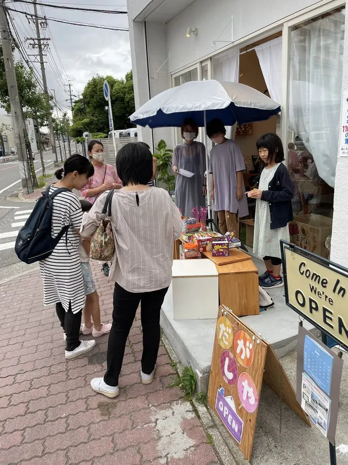 地域のカフェ『街と珈琲』さんの軒先を借り、子どもたちにも「子ども店員さん」としてお店を手伝ってもらっています。子どもたちは開催日目指して遊びに来てくれ、だがしを並べたり、接客、計算、売り込みととても活躍してくれています。