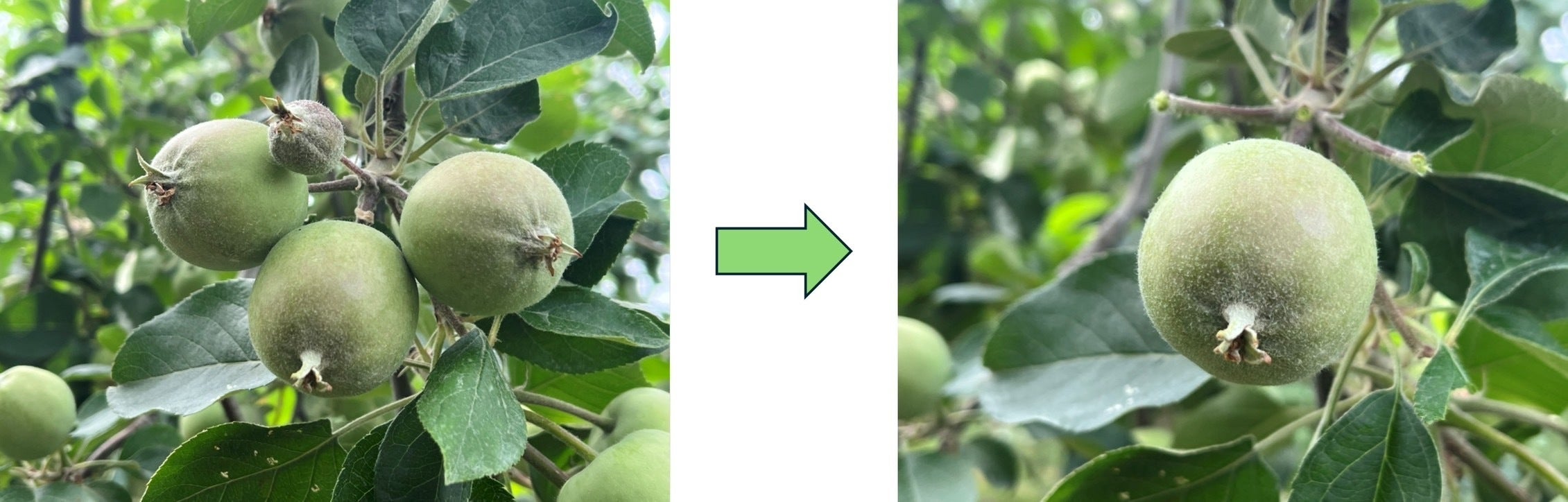 現在りんご畑では、果実のうち中心果を残して他を摘み取る「摘果作業」を行なっています。摘果作業を行うことで、中心果を大きく成長させることができます。