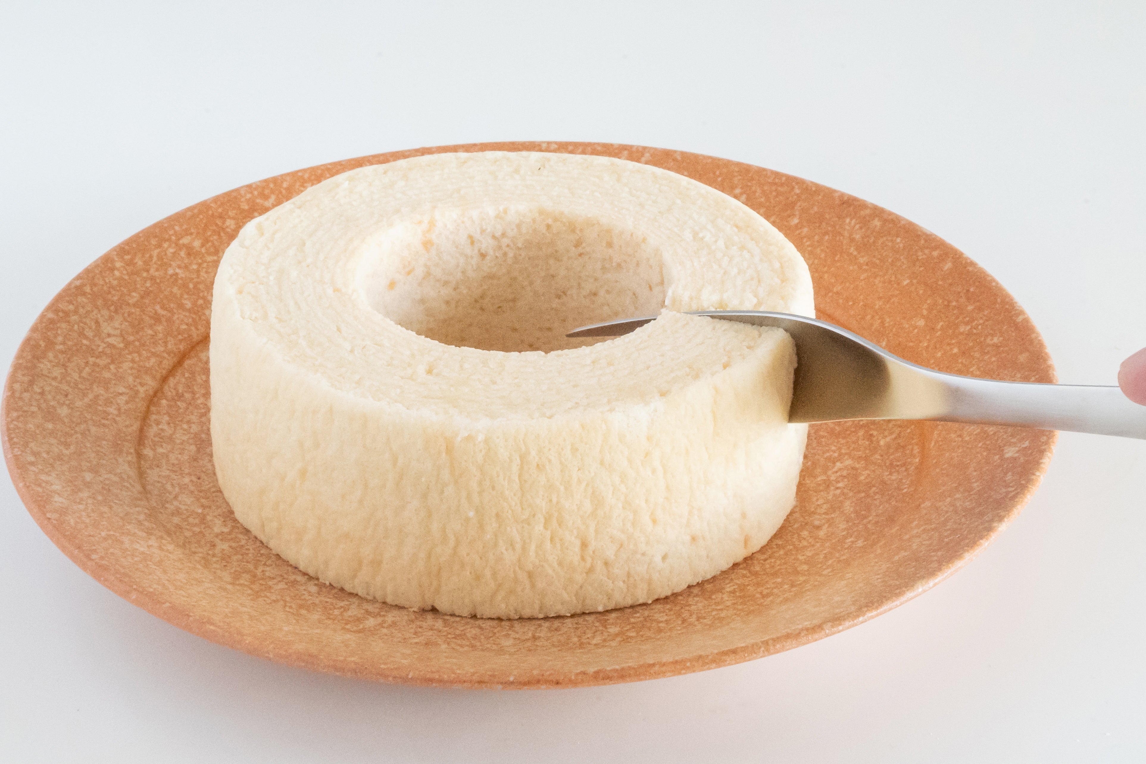 実際に開発中の商品。お豆腐屋さんの作るというコンセプトに、豆腐をイメージさせる白いバウムクーヘンです。甘みがすっきりとしたヘルシーなバウムクーヘンが仕上がりました。より美味しいものになるよう、現在開発ブラッシュアップ中です。