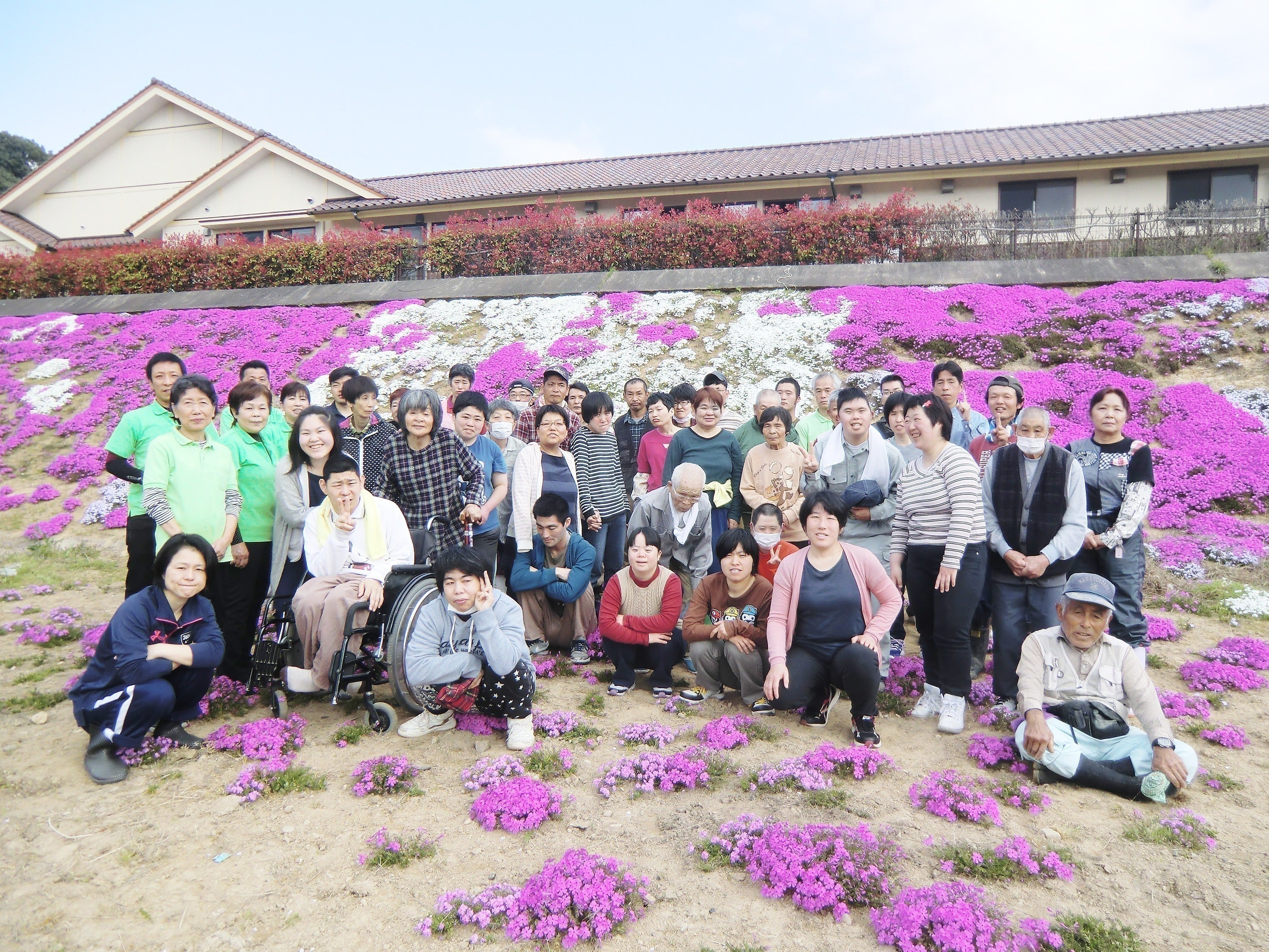 利用者とこのめの里スタッフで。春は施設の下に綺麗な芝桜が一面に咲きます。