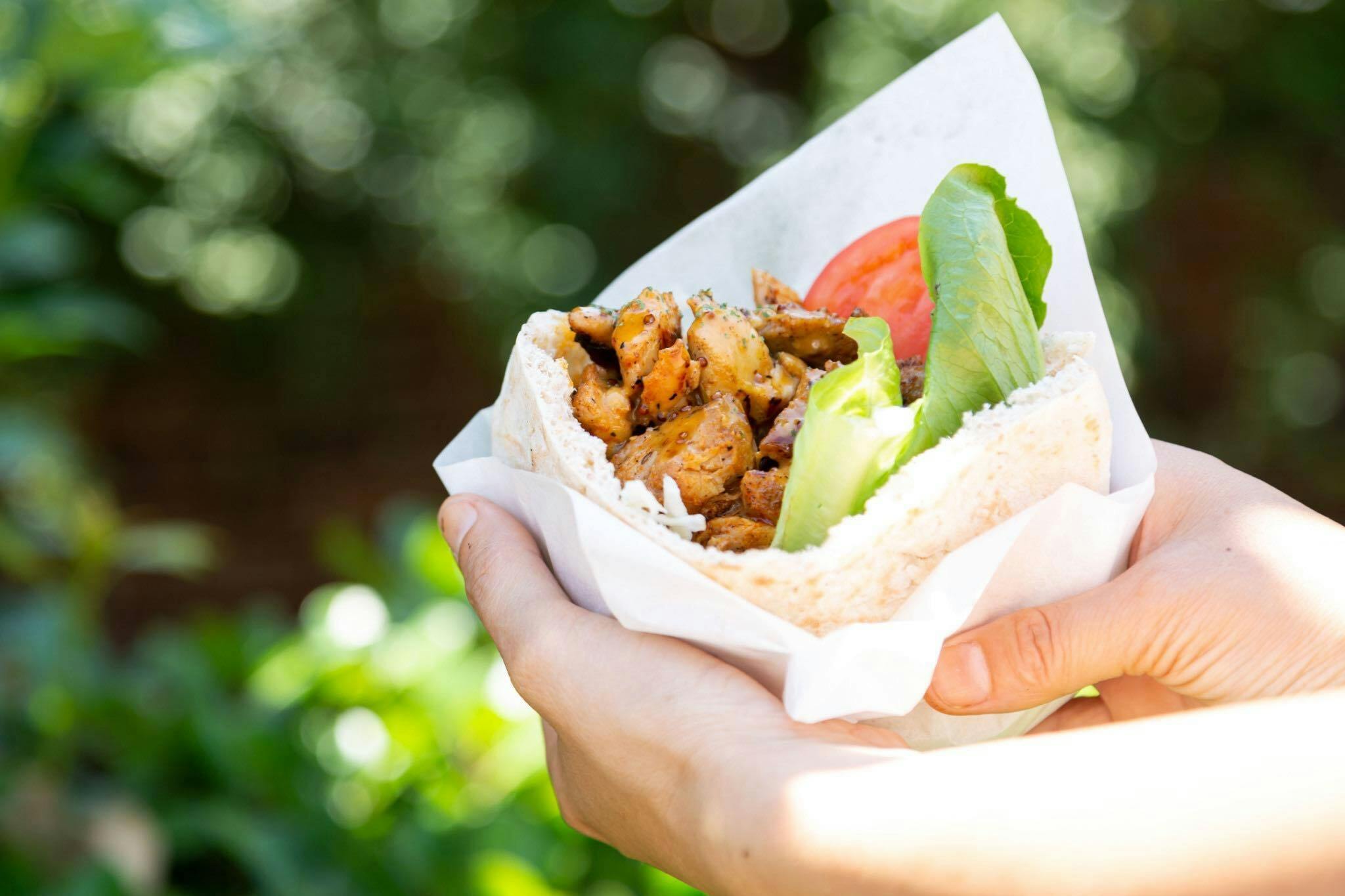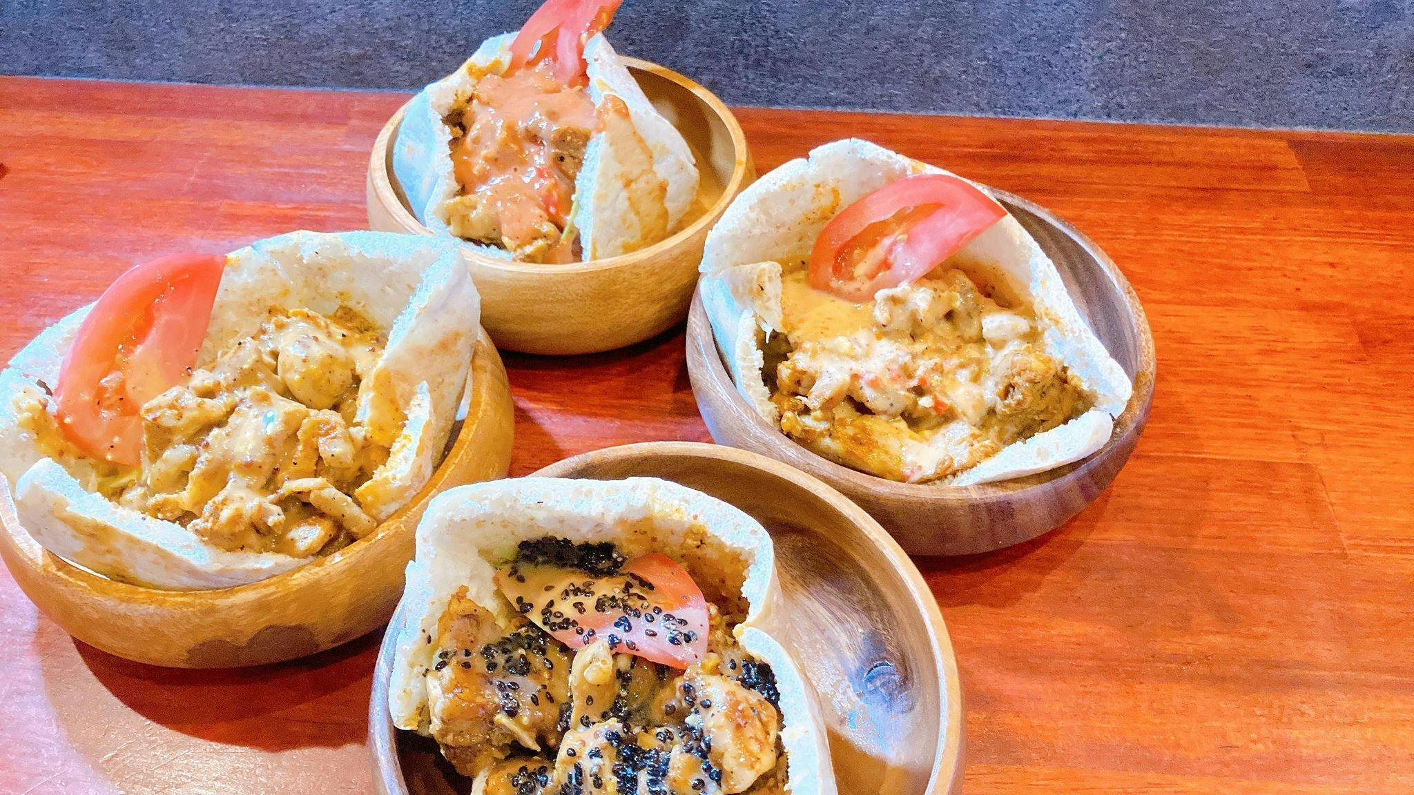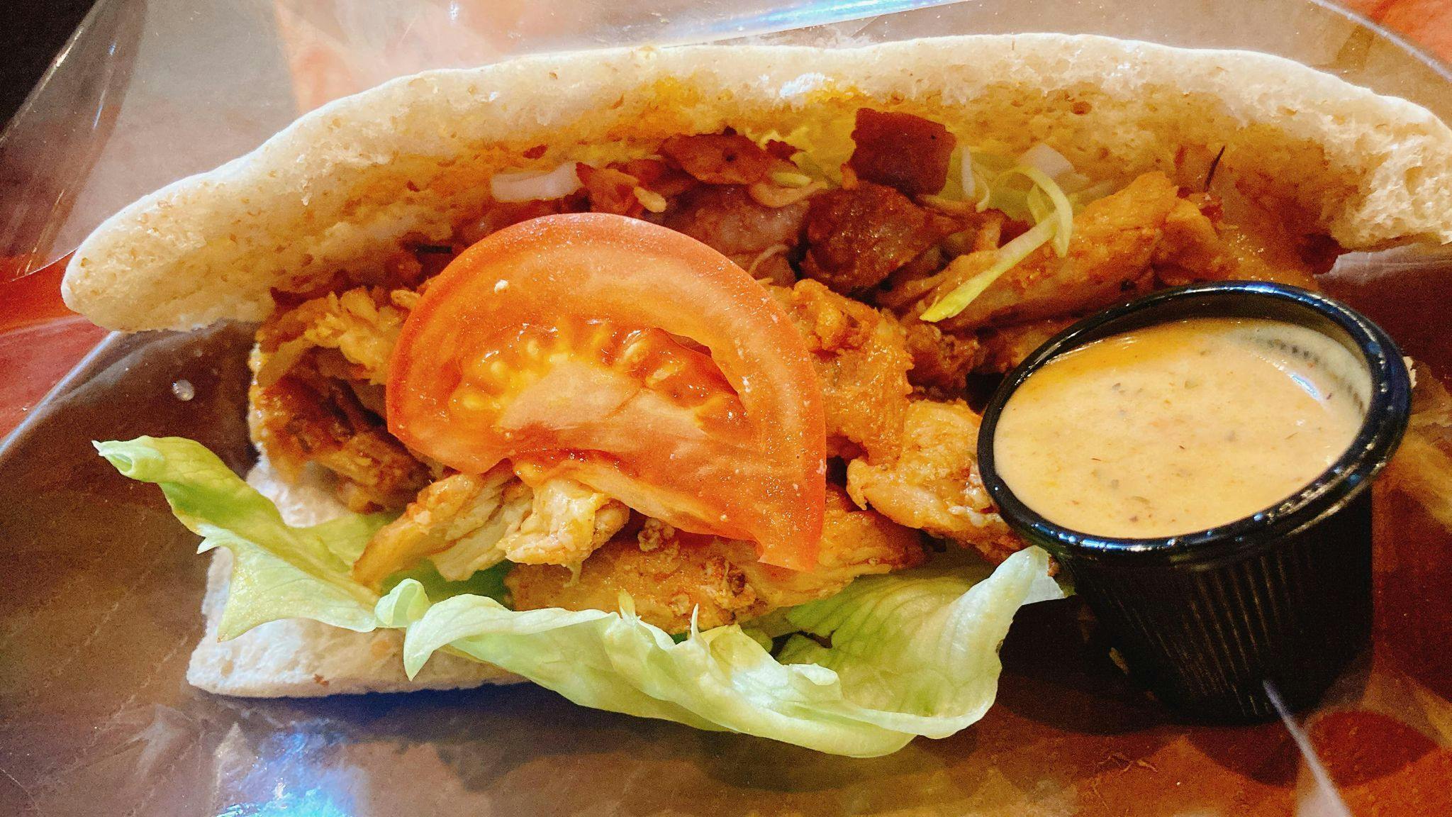 さんばんやの新たな名物、”トルチキ”のケバブはドネルケバブ!塊肉でじっくり焼いた鶏肉をたっぷりと、トマトなどの野菜と一緒にピタパンにはさんでいただきます。味の決め手はケバブソース。いちから手作りしていて、めちゃうまなんですよ。