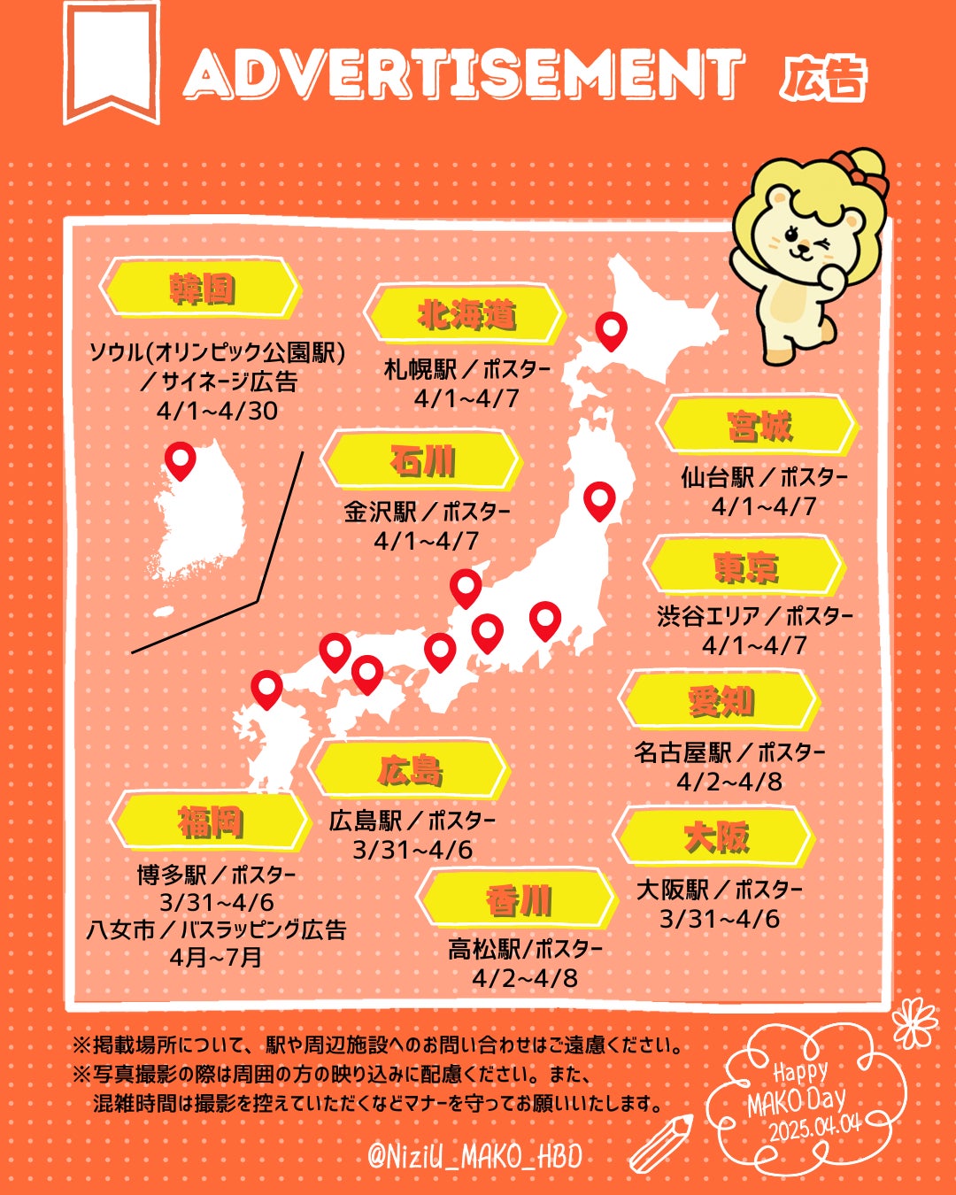 2025/03/28 16:30いよいよMAKOちゃんのお誕生日まであと1週間となってまいりました!改めましてたくさんのご支援ありがとうございました!今年も全ての目標を達成し、最終目標を上回るご支援がありましたので、当初予定に加え、仙台・高松・広島の3か所での広告掲載が追加決定となりました。これでMAKOセンイル広告の掲載としては初地区となる金沢・高松を含めて史上最大の韓国・日本10地域での広告掲載となります。東京も渋谷エリアに初進出です!各地の広告掲載期間については、添付の画像をご覧くださいませ。※広告をご覧になる際のご注意※今年は新しいエリアでの広告掲載が多くなりますが、駅係員や周辺施設等へ、広告掲載場所のお問合せ等はご遠慮ください。また、広告周辺が混雑している場合は、その場から離れる等、周りの方のご迷惑にならない様、ご配慮をよろしくお願いします。 もっと見る
