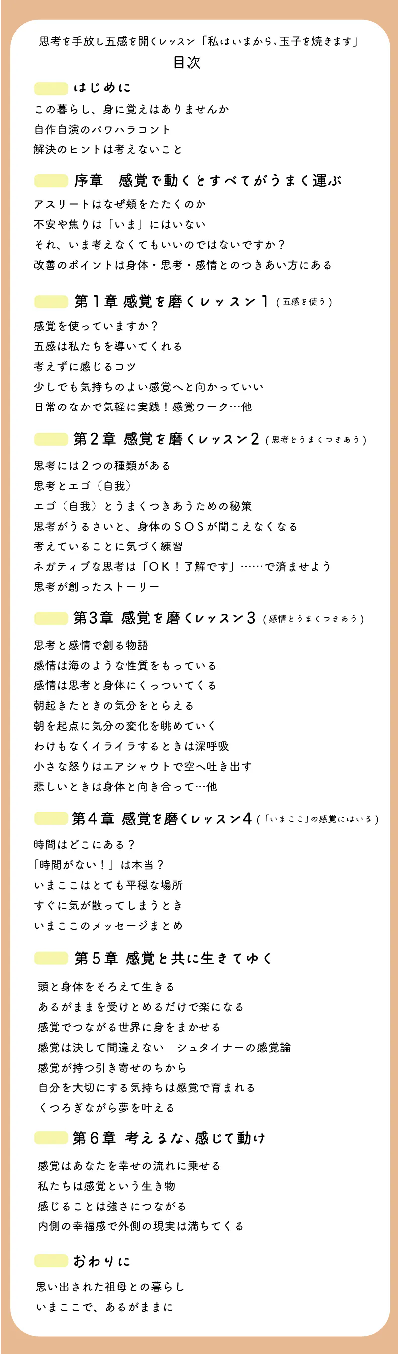 五感、思考、感情と上手につきあい、幸せで豊かな気持ちで毎日を生きるというごくシンプルな解決法を提案しています。