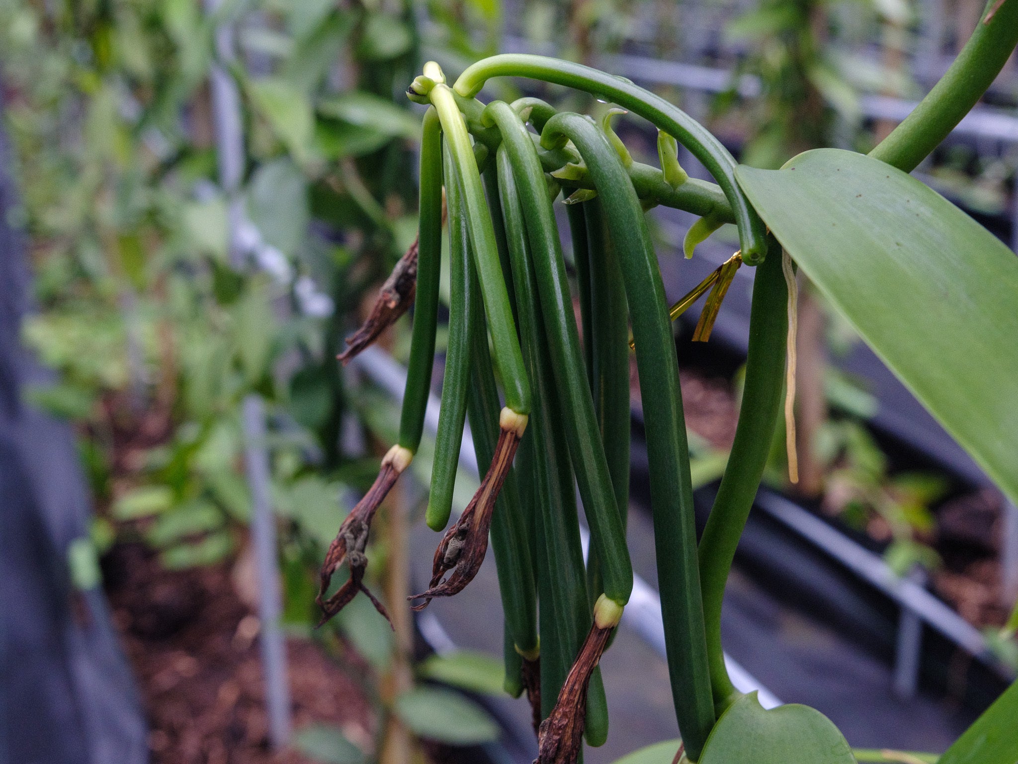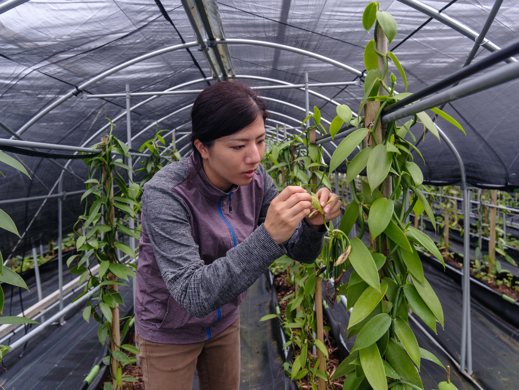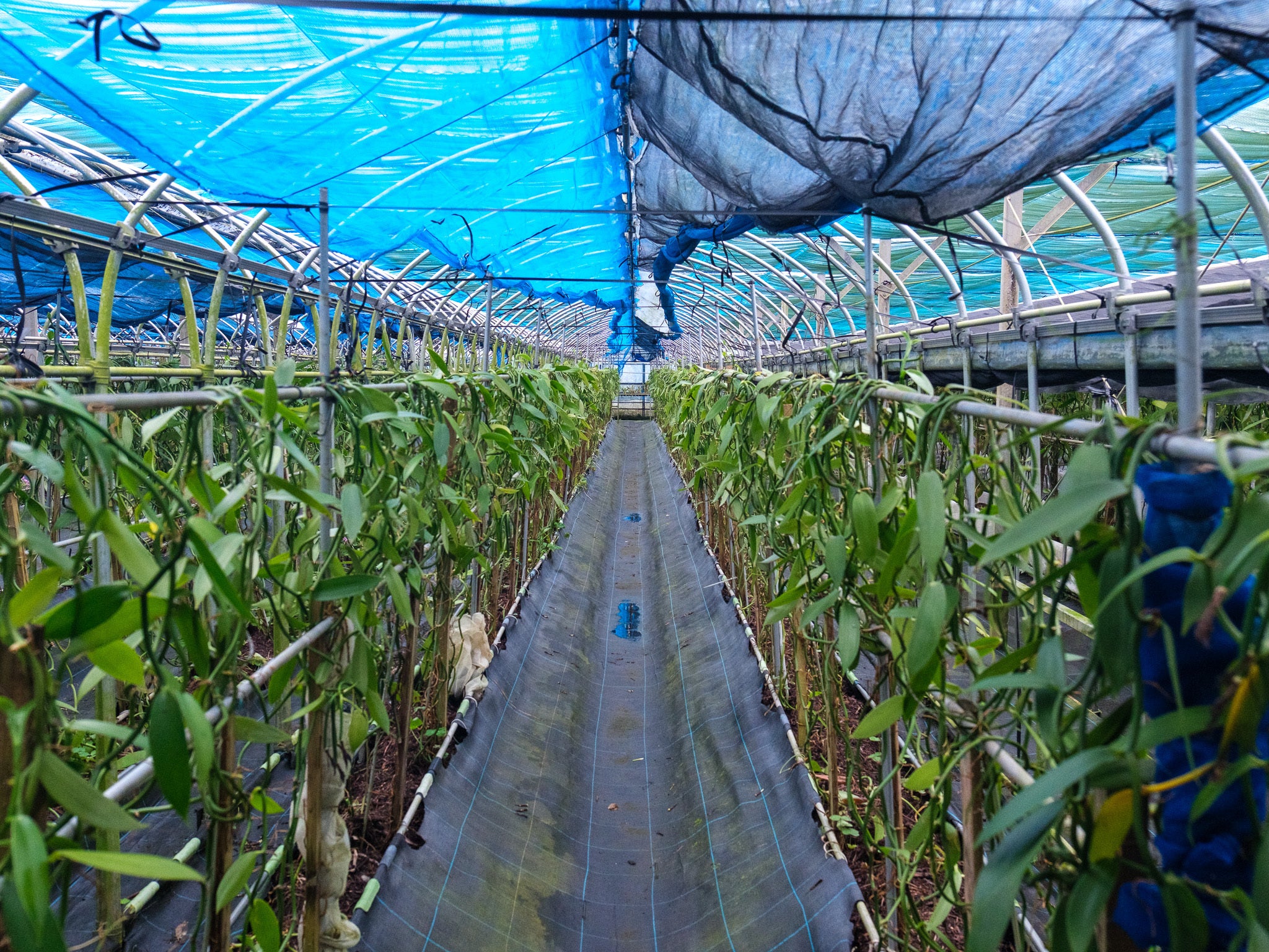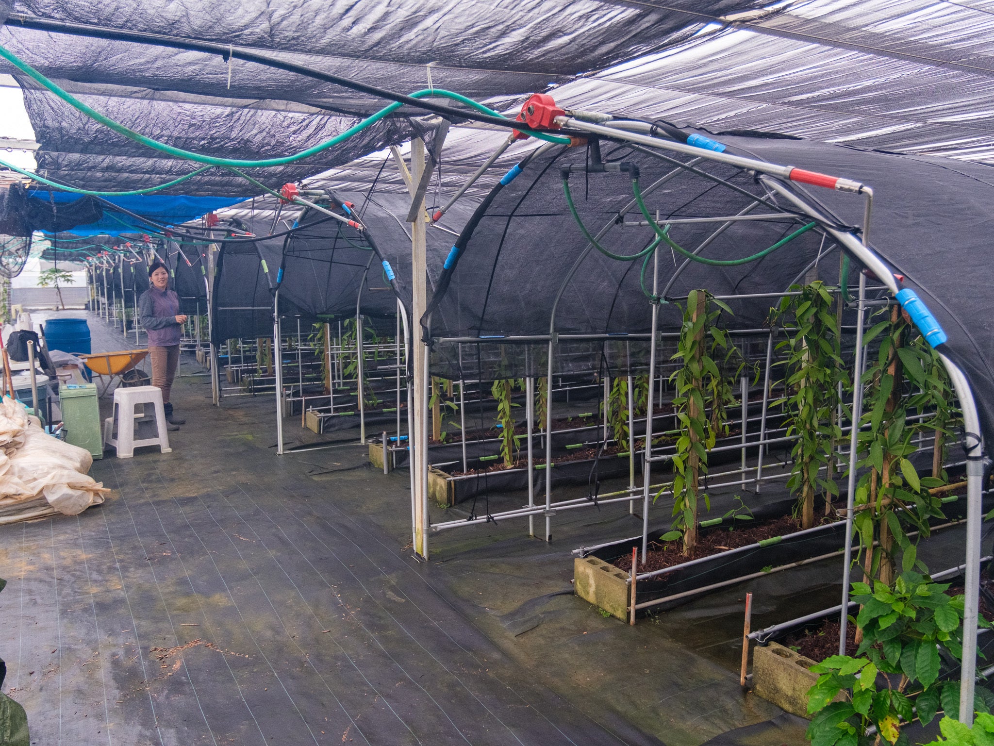 1トンのバニラを生産するには、バニラハウスが10棟ほど必要です。現在2棟+新規設備作り中の2棟。