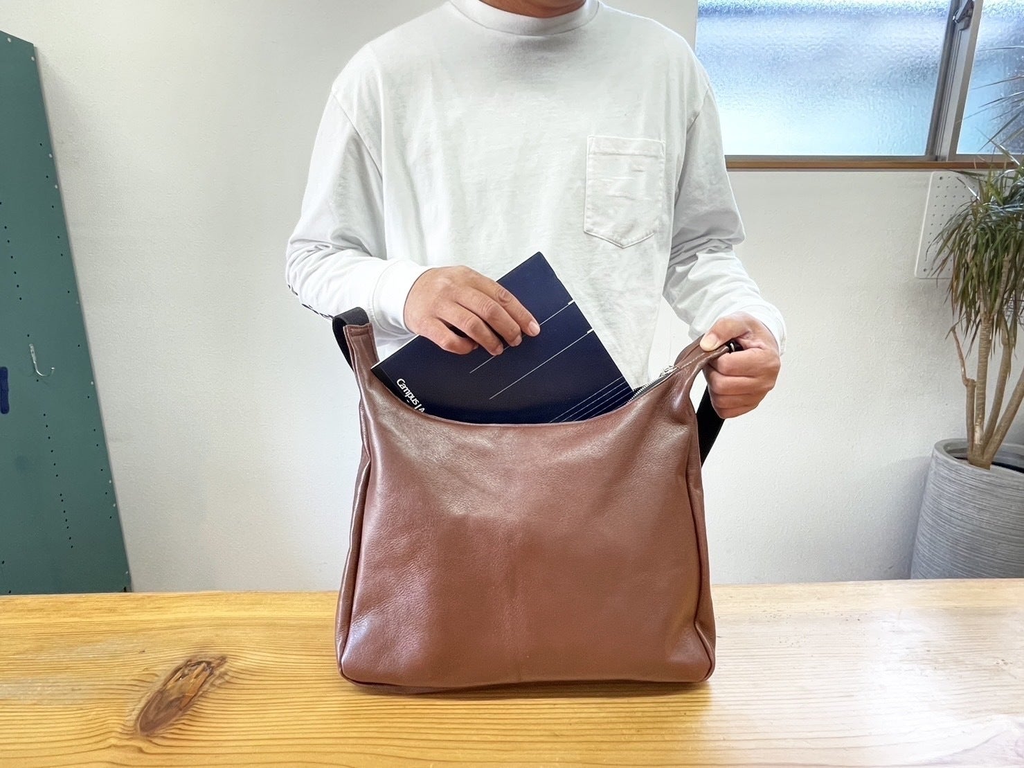 底は15㎝マチでA4サイズが入るから、書類や本、雑誌などたっぷり収納可能です。荷物の多いビジネスシーンや通学、趣味バッグとしても◎