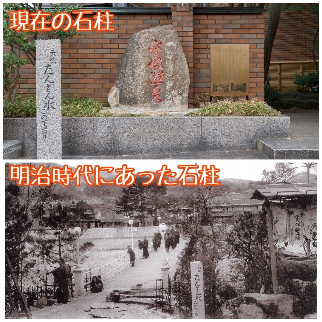 阪急宝塚駅近くの「ホテル若水」の前には「天然たんさん水 この下にあり」と刻まれた石柱があります。これは武庫川の氾濫で消失したとされる石柱を復元したものです。