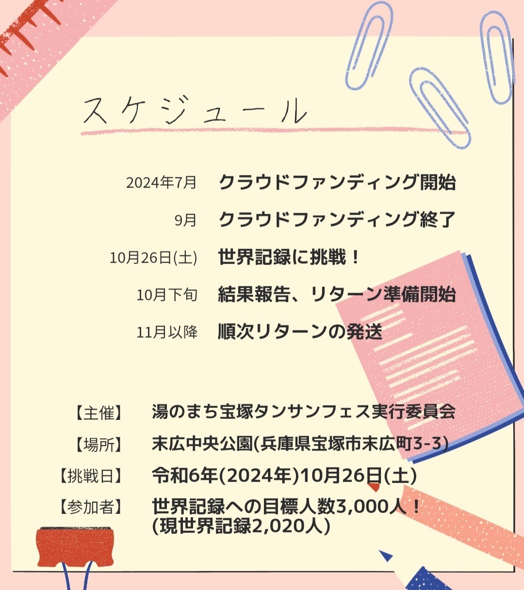 2024/07/24 15:32宝塚市大使の田辺眞人さんから本プロジェクトについて応援メッセージを頂戴しました!ありがとうございます(^^♪また、既にご支援くださった皆様におかれましても本当にありがとうございます。参加者の皆様に安全に楽しくご参加いただけるよう引き続き検討を進めています☆コロナ禍前においてもこれほどの大人数での挑戦は類を見ないそうです・・・!必ず成功できるよう頑張りますので、皆様のご支援をどうぞよろしくお願いいたします。 もっと見る