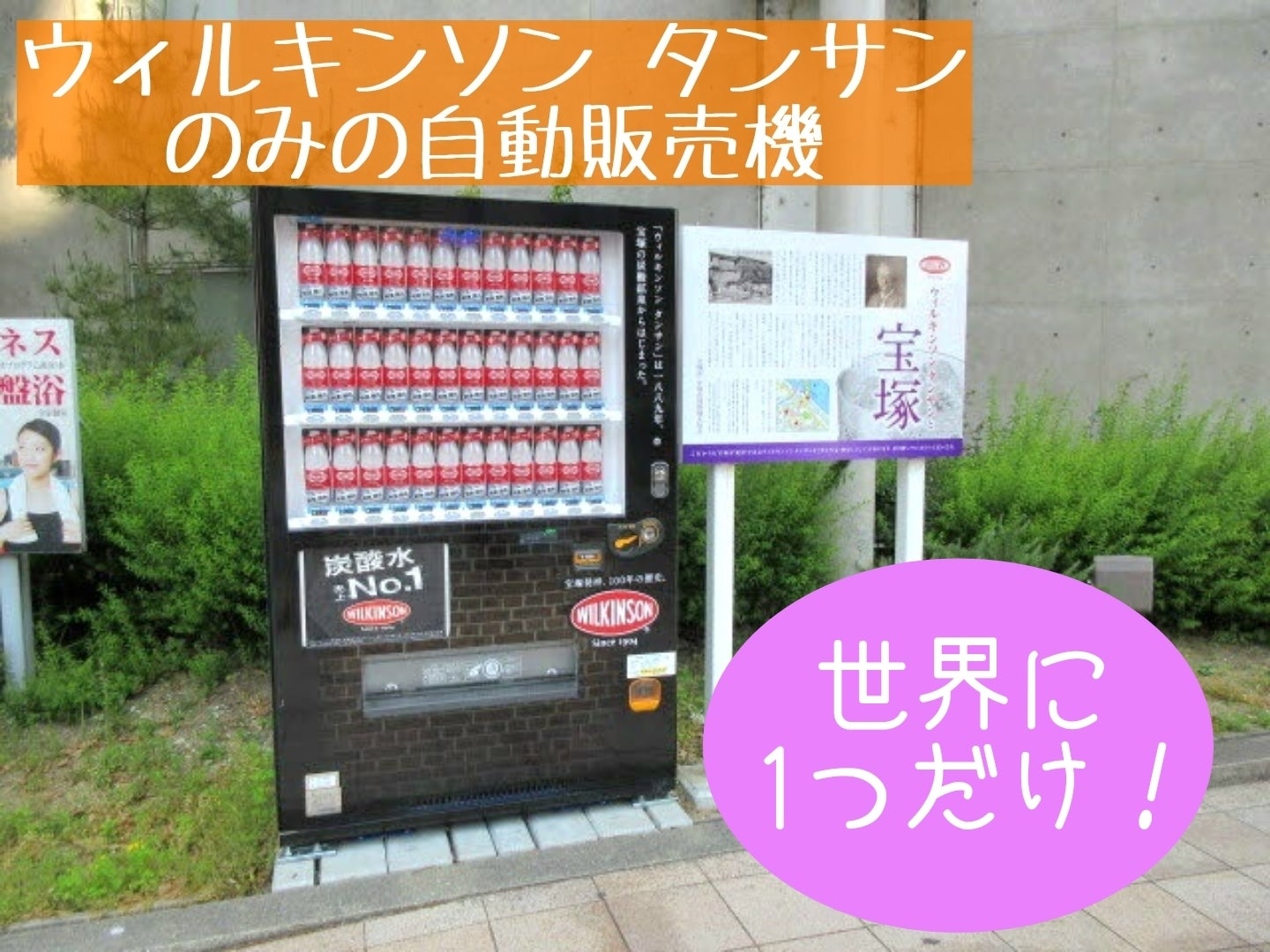 「ホテル若水」の前にある「天然たんさん水 この下にあり」と刻まれた石柱の、道路を挟んだ向かい側には、ウィルキンソン タンサンのみの自動販売機が設置されています!