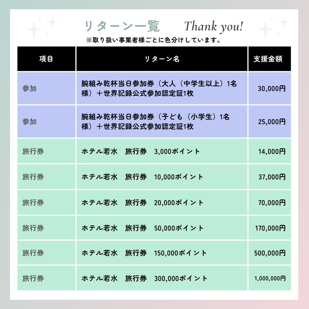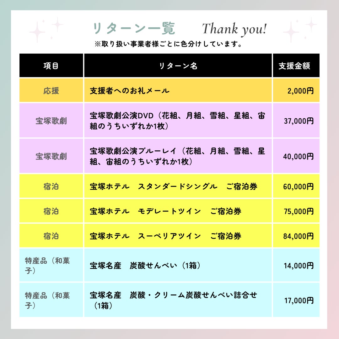 2024/08/14 10:19宝塚市大使の手塚眞さんから本プロジェクトについて応援メッセージを頂戴しました!ありがとうございます(^^♪既にご支援くださった皆様、本当にありがとうございます。また、ご支援をご検討中の皆様におかれましても、どうぞよろしくお願いいたします。<m(__)m>参加者の皆様に安全に楽しくご参加いただけるよう引き続き検討を進めています☆必ず成功できるよう頑張りますので、皆様のご支援をよろしくお願いいたします。♪参加者も募集中です♪下記のサイトからお申込みください。心よりお待ちしております(*^▽^*)↓事業の詳細や申込はこちら↓【宝塚市ホームぺージ】https://www.city.takarazuka.hyogo.jp/kanko/kankoinfo/1051316/1056274.html もっと見る【ご支援総額10万円、やっと到達しました…!】
