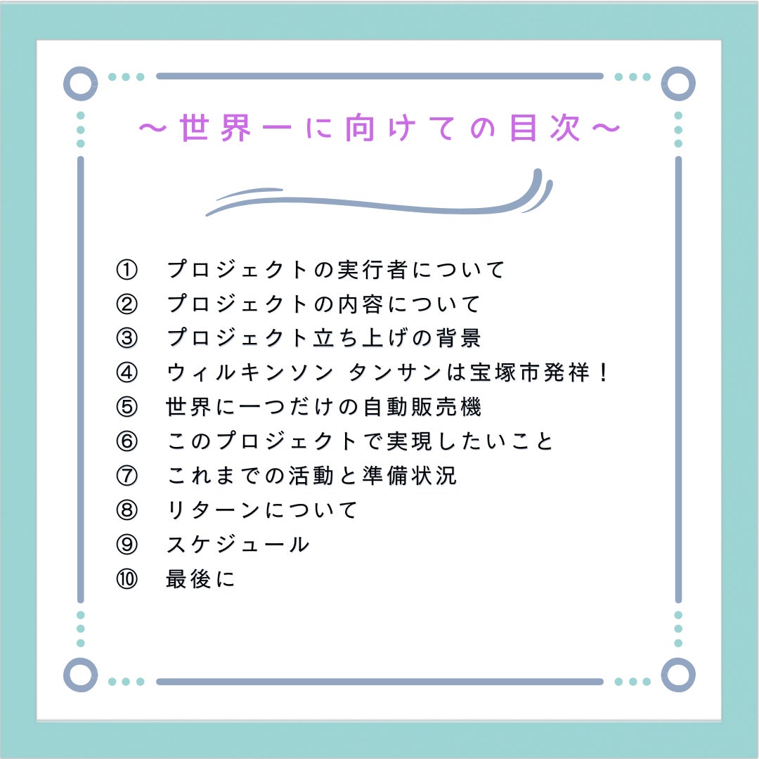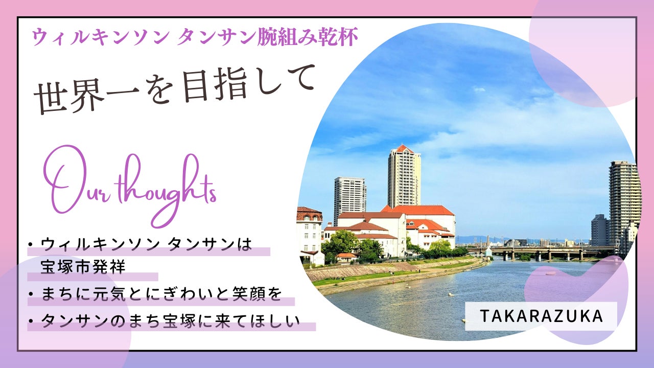 このプロジェクトは宝塚市民のみならず、宝塚市を愛する多くの皆さんと共に取り組むものです。同じ目標に向かって心を一つにし、世界一達成の瞬間を皆さんとともに迎えたいと思っています。世界記録樹立により子どもから大人まで多くの方々の笑顔の花が咲き、今以上に宝塚に元気やにぎわいが生まれることを強く願っています。また、プロジェクトの成功により、宝塚市の貴重な観光資源であるウィルキンソン タンサンを全国に広く発信し、PRしていきたいと思っています。