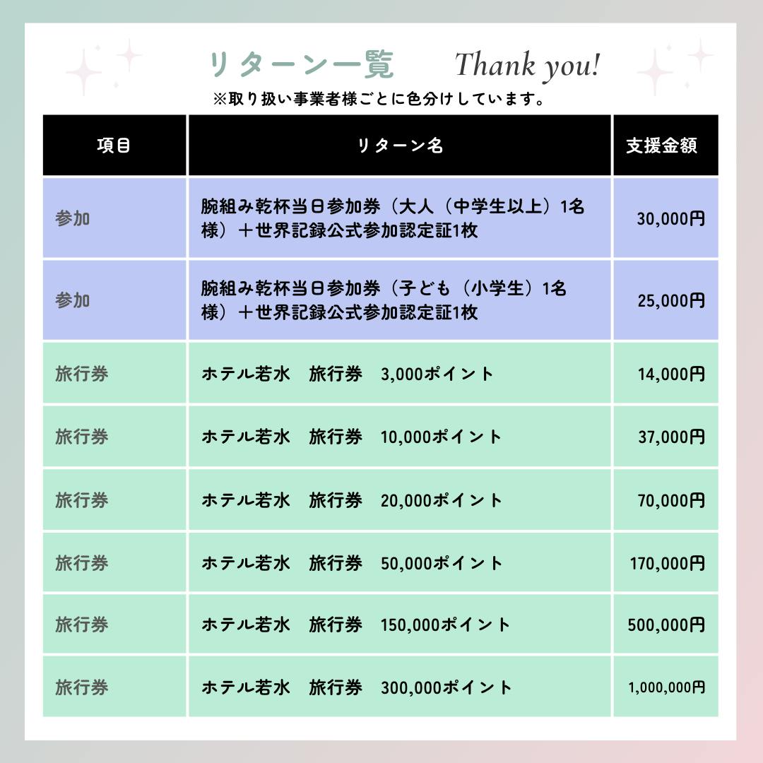 プロジェクトの挑戦に向けてやることは盛沢山であり、この挑戦には多くの時間と費用がかかります。でも、私たちには同じ想いを持った仲間がいます。そしてその想いに賛同し、一緒に挑戦してくれる皆さんがいます。ワンチームになり、何としてもこのプロジェクトに挑戦し、世界一の記録を樹立したいと思っています。