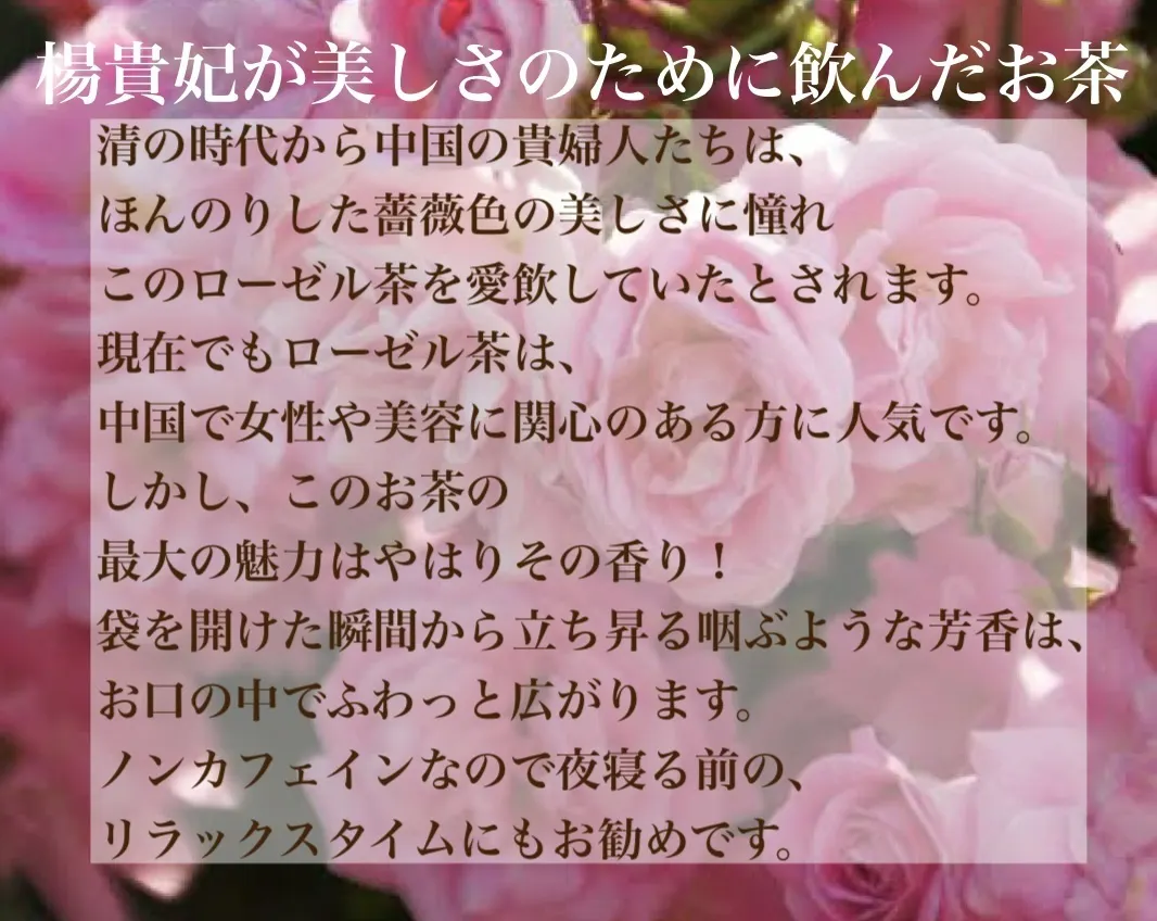 バラ、ジャスミン、ローゼル、クコの実などを使った保存料、着色料、香料無添加の天然素材。