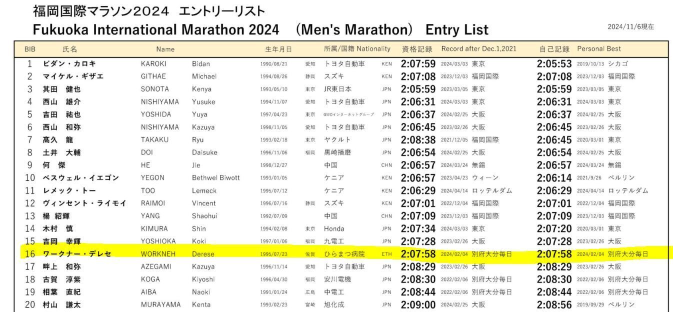 「ランナー デレセの挑戦!故郷エチオピアの学校を増築したい」を応援してくださった皆様、こんにちは。今度の日曜日、12月1日に、デレセさんが福岡国際マラソンに出場します。今回もエチオピアで高地トレーニングをして、準備万端だと思われます。午後12時10分スタートです。https://www.fukuoka-international-marathon.jp画像は公式HPより、エントリーリストです。お近くの皆さまはぜひ沿道でご声援ください!