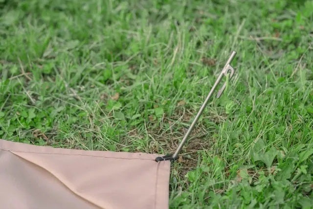 A:別途ペグ購入は必要になりますが、ペグ専用止め紐付きです。風対策にご利用ください 。
