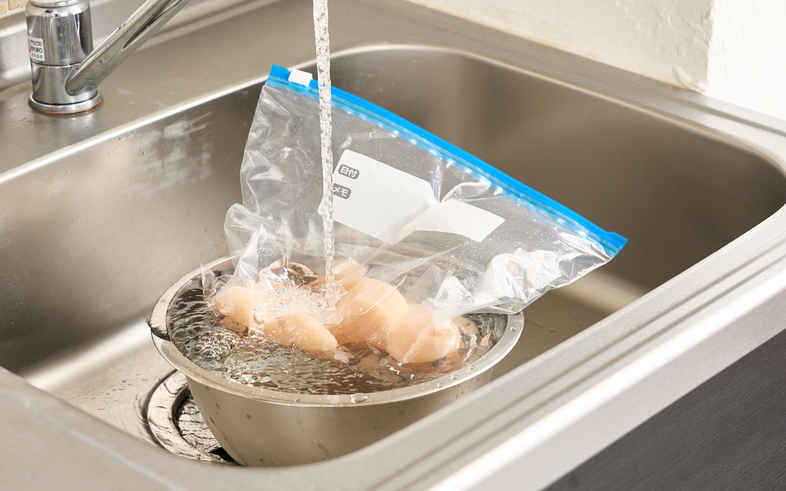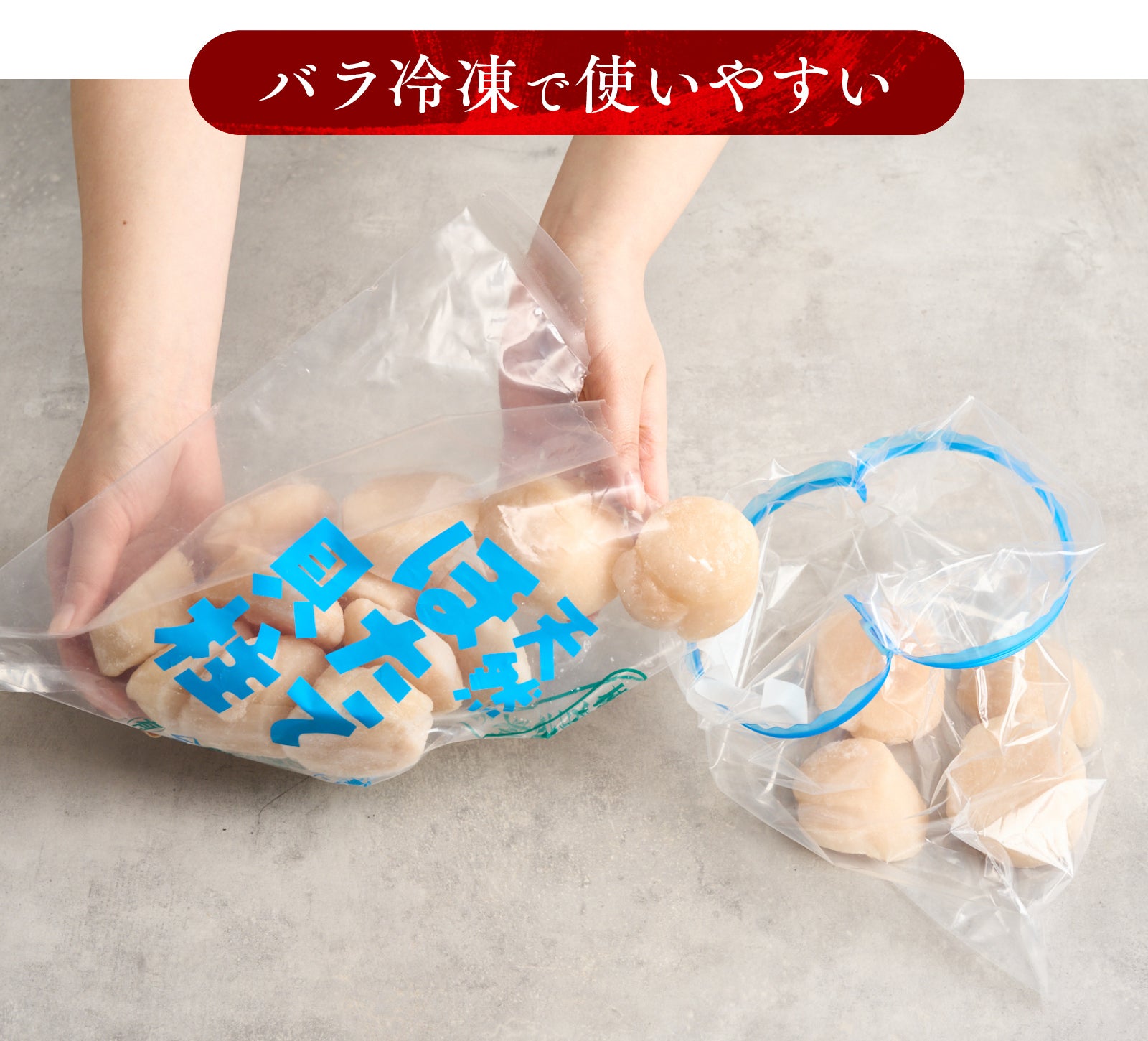 お急ぎの場合はホタテをポリ袋などにいれ、流水で解凍して下さい。