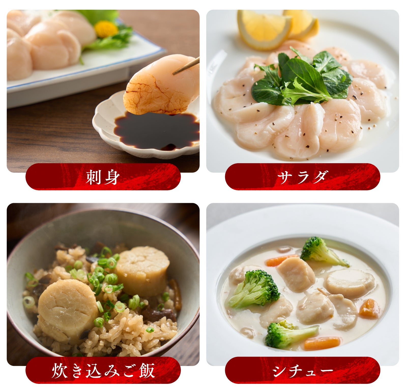 大粒の貝柱は身の締まりが良く、甘み・旨みが凝縮されています。