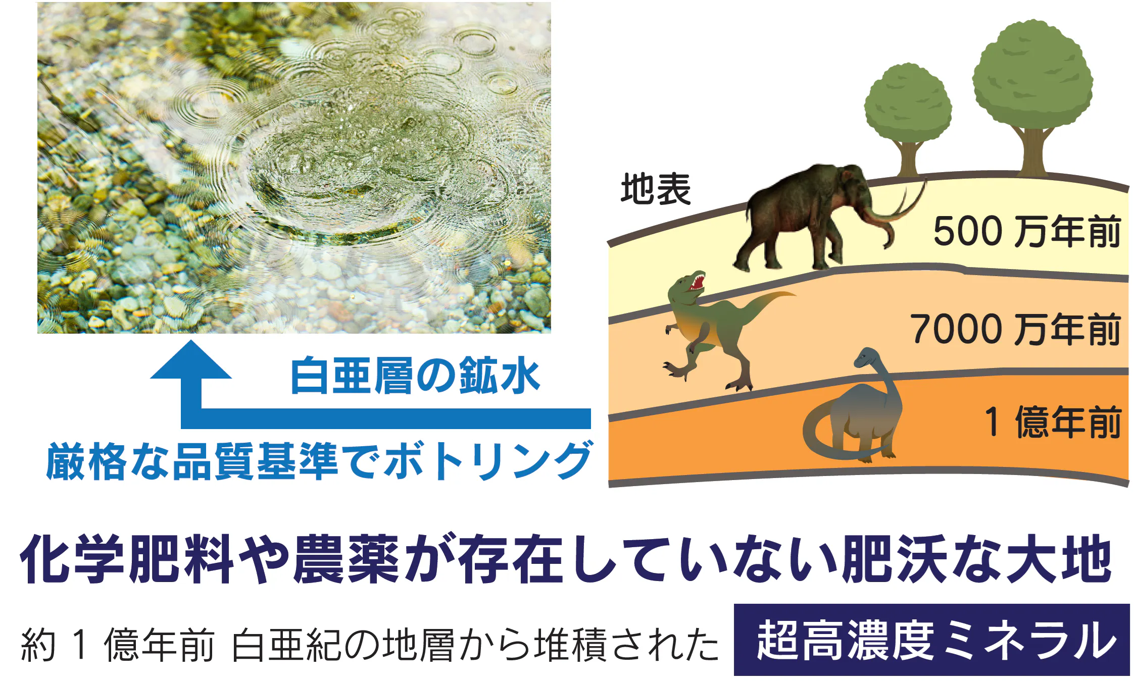 今からさかのぼること1億年程前、恐竜たちが生きた白亜紀の地層がビタータスの水源です。白亜紀の地層をめぐった純粋な天然水をボトリングし、採水後に加えられるのは炭酸のみです。ビタータスは希釈・加工等を一切していないナチュラルミネラルウォーターです。