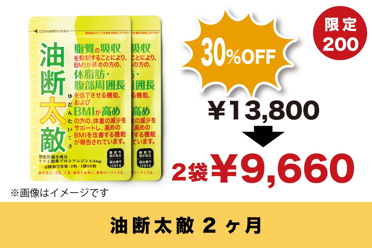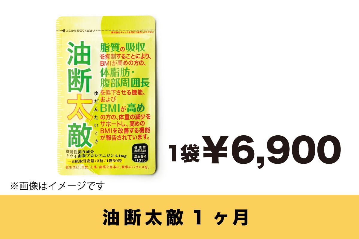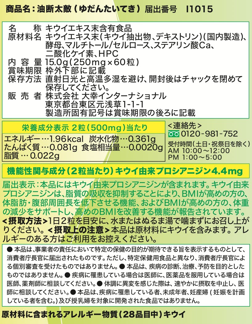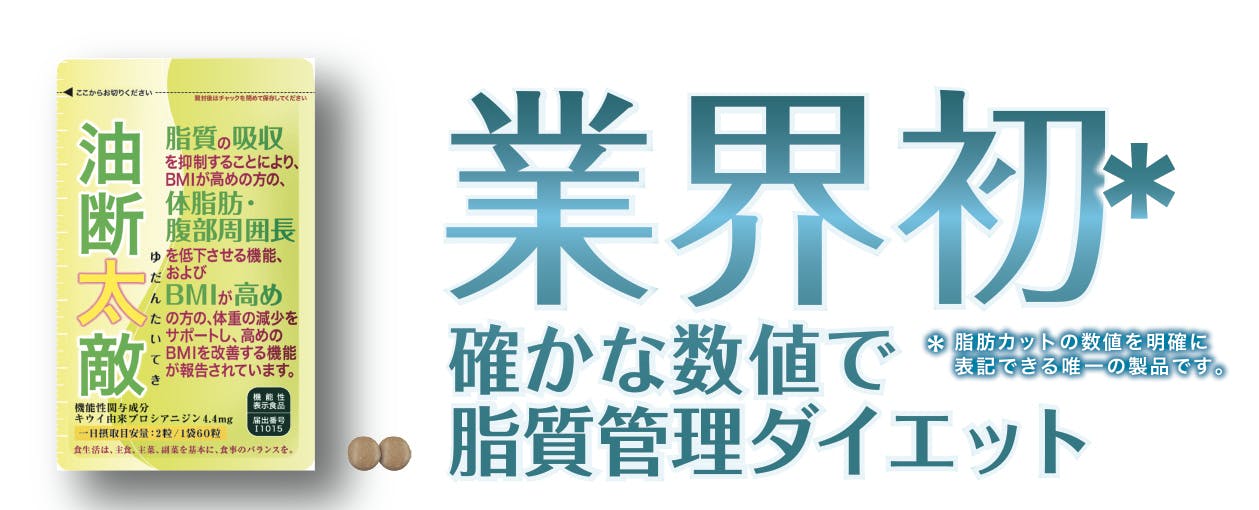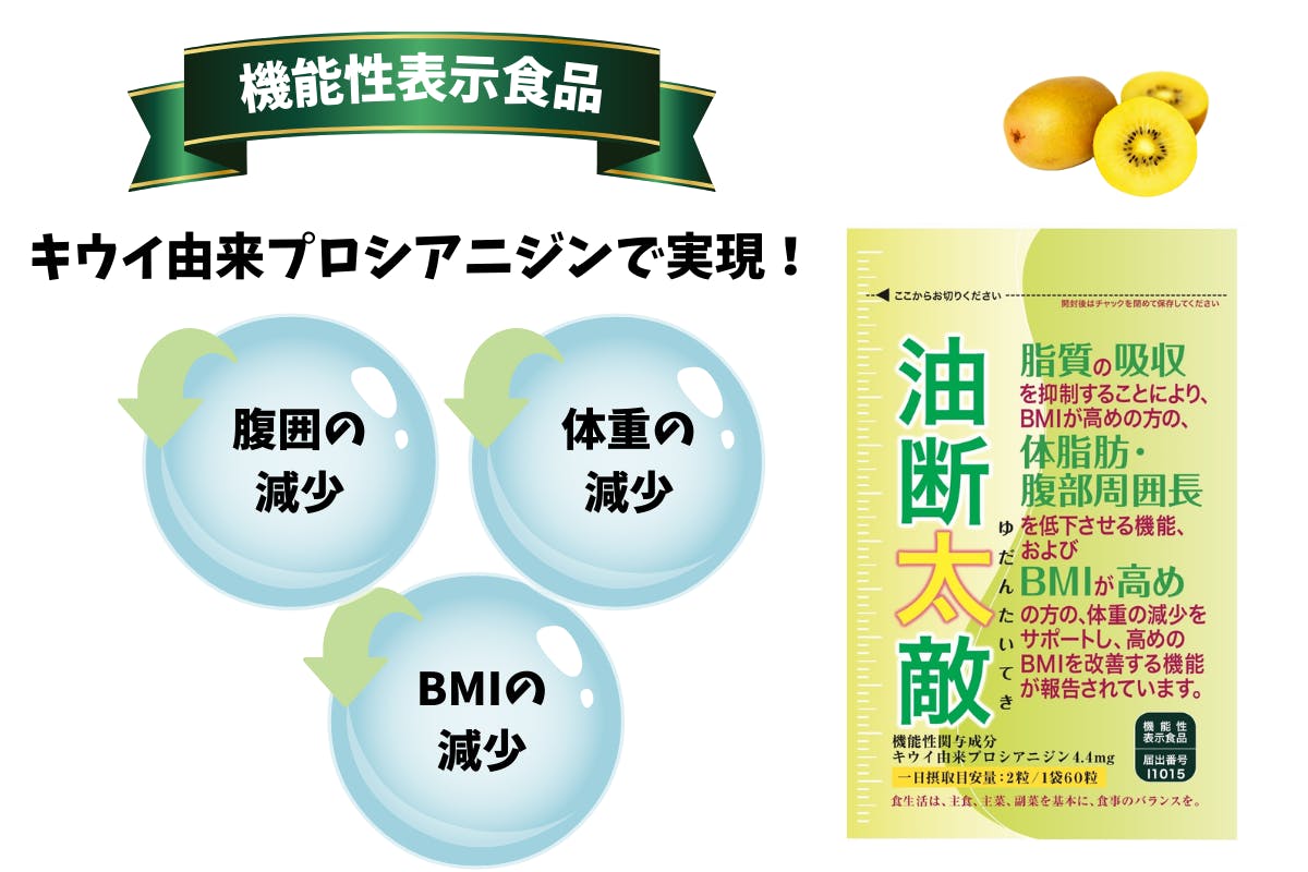 BMIが高めの方の、体脂肪・腹部周囲長を低下させる機能、およびBMIが高めの方の、体重の減少をサポートし、高めのBMIを改善する機能が報告されているキウイ由来プロシアニジンは機能性関与成分として、4.4mg(油断太敵サプリ2粒分)で脂質15gをカットするという効果があります。
