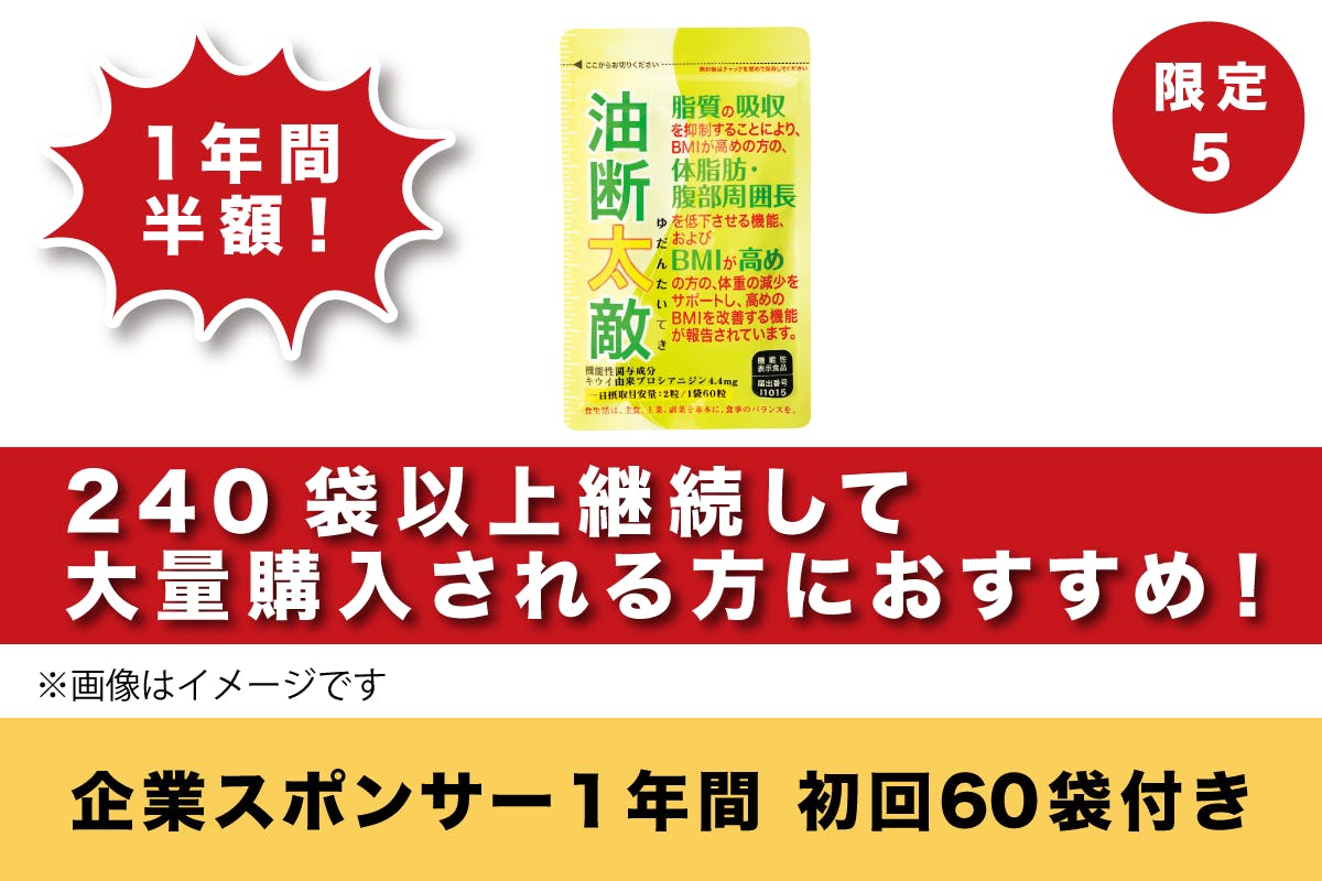 2024/07/27 16:00クラウドファンディング終了まで、残り4日となりました。ページを見に来てくれた皆様、ありがとうございます!複数のリターンの中でも、大量購入したい方におすすめのリターンがございます。初回購入時60袋付きで、今後1年間半額で購入できるスポンサー権利のリターンです。油断太敵は継続するほど効果がでてきますので、まず1袋試してしていただいた方にはその後も2袋、3袋と継続していただきたいです! もっと見る