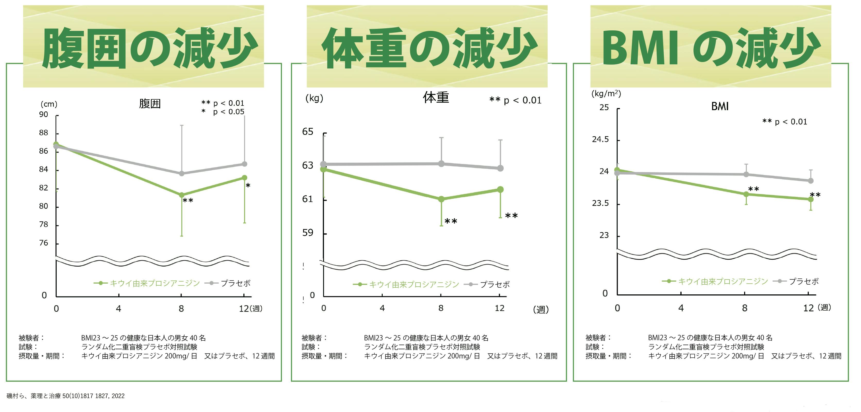 油断太敵に含まれている「キウイ由来プロシアニジン」を毎日摂取すると、大体2ヶ月~3ヶ月で腹囲、体重、BMIが減少するというデータが出ております。
