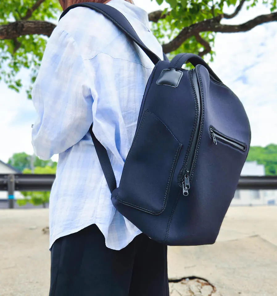 私たちは、大分県国東市に拠点を置き42年もの間、高品質の国産ウェットスーツ・ドライスーツを製造してきました。2005年からウェットスーツ素材の「耐水性」「頑丈」といった特性を活かした、オリジナル製品を開発しており、「湯たんぽ」「マスク」「保冷剤グッズ」などから、「介護用品」まで製造しています。様々な製品をお届けする中で、お客さまから頂いたのが、普段使いできる『丈夫なバッグ』を作って欲しいという声。皆さまからの多くの声にお応えするべく、新製品の開発に取り組みました。そこで完成したのが『ウェットスーツ素材で作ったバックパック』。一つ一つの製品を職人が手作業で作ることで、耐水性・耐久性に優れた軽量のバックパックを作ることができました。