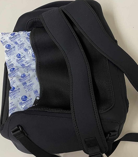 背面ポケットはメッシュ素材となっており、夏でも蒸れにくくなっています。また、保冷剤などを入れることで背中の熱を下げ『熱中症予防』になります。