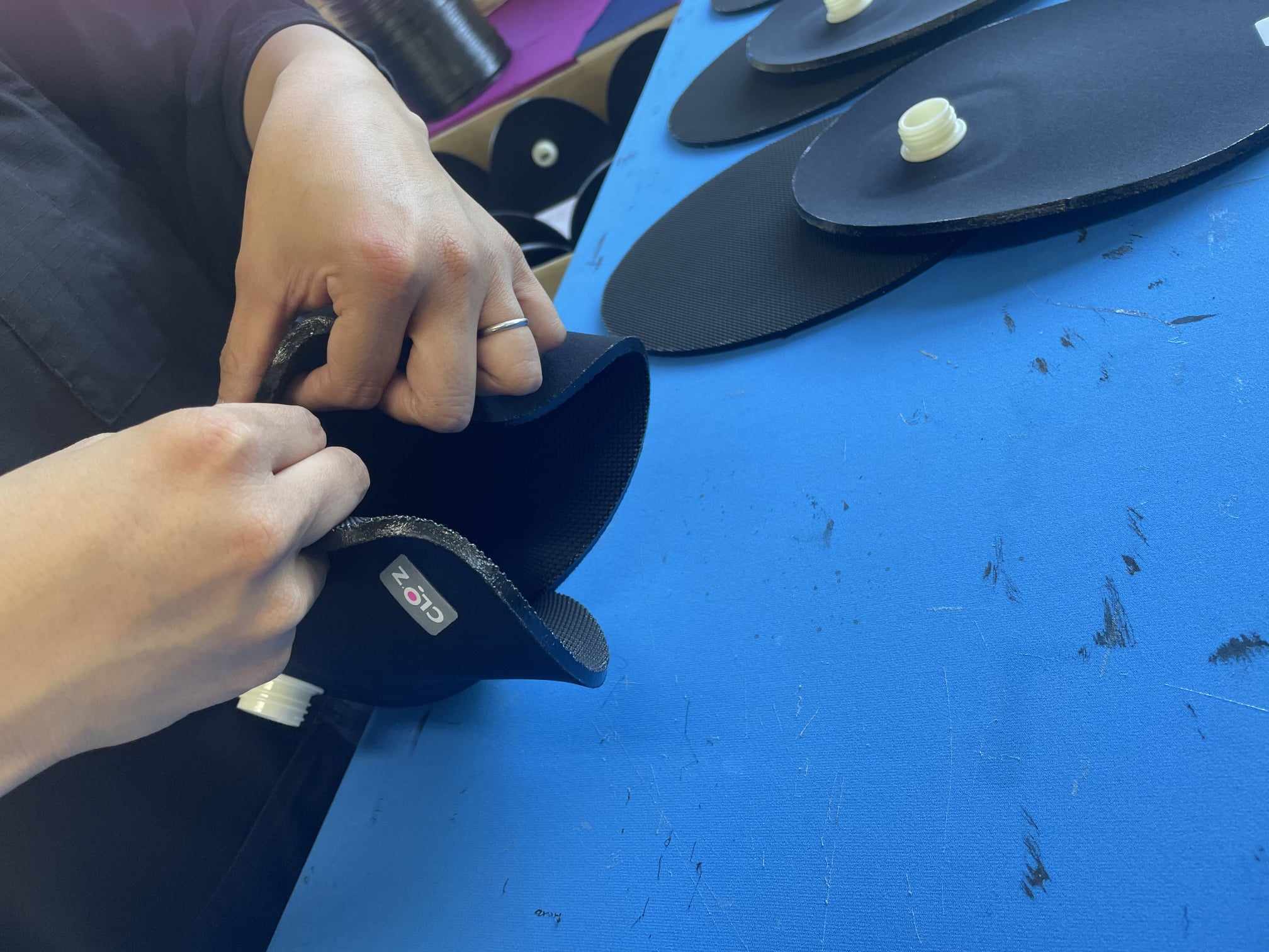 丸みを帯びた立体構造になるため、機械での製造が難しく、ゴムの型抜き、接着、圧着、縫製、検品までのすべての工程を、自社工場で手作業により行っています。