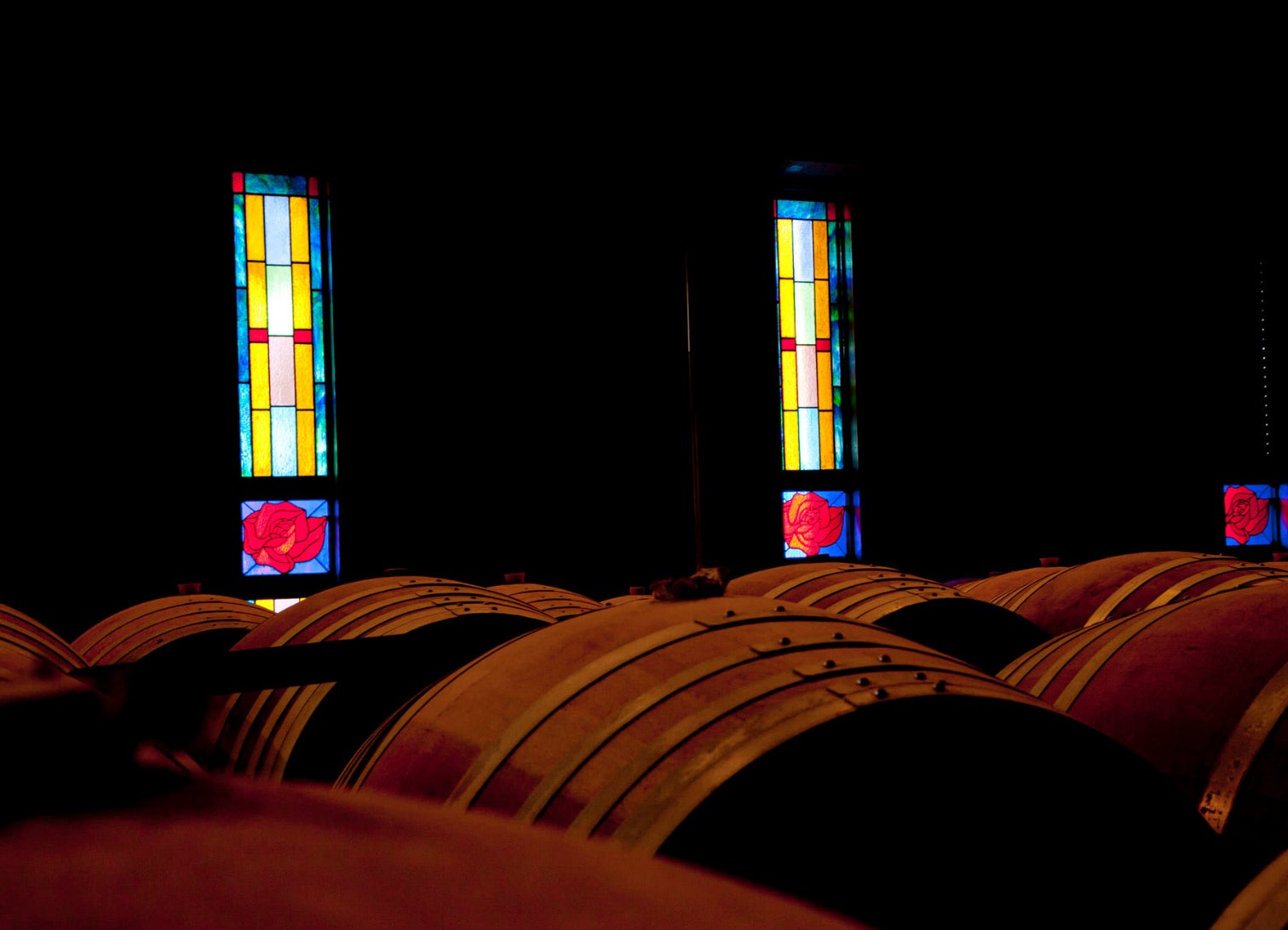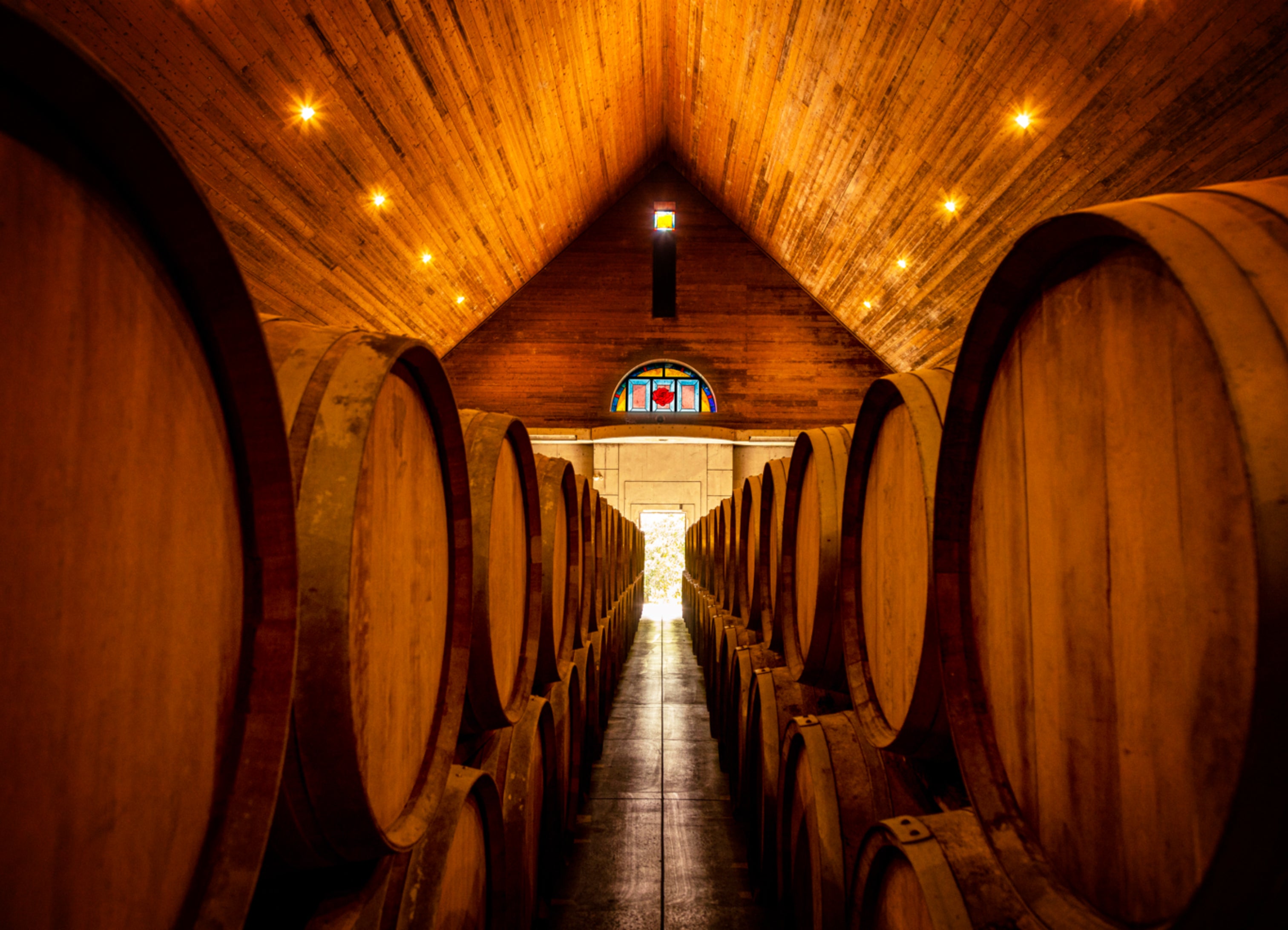 貯蔵庫に並ぶ樽の様子