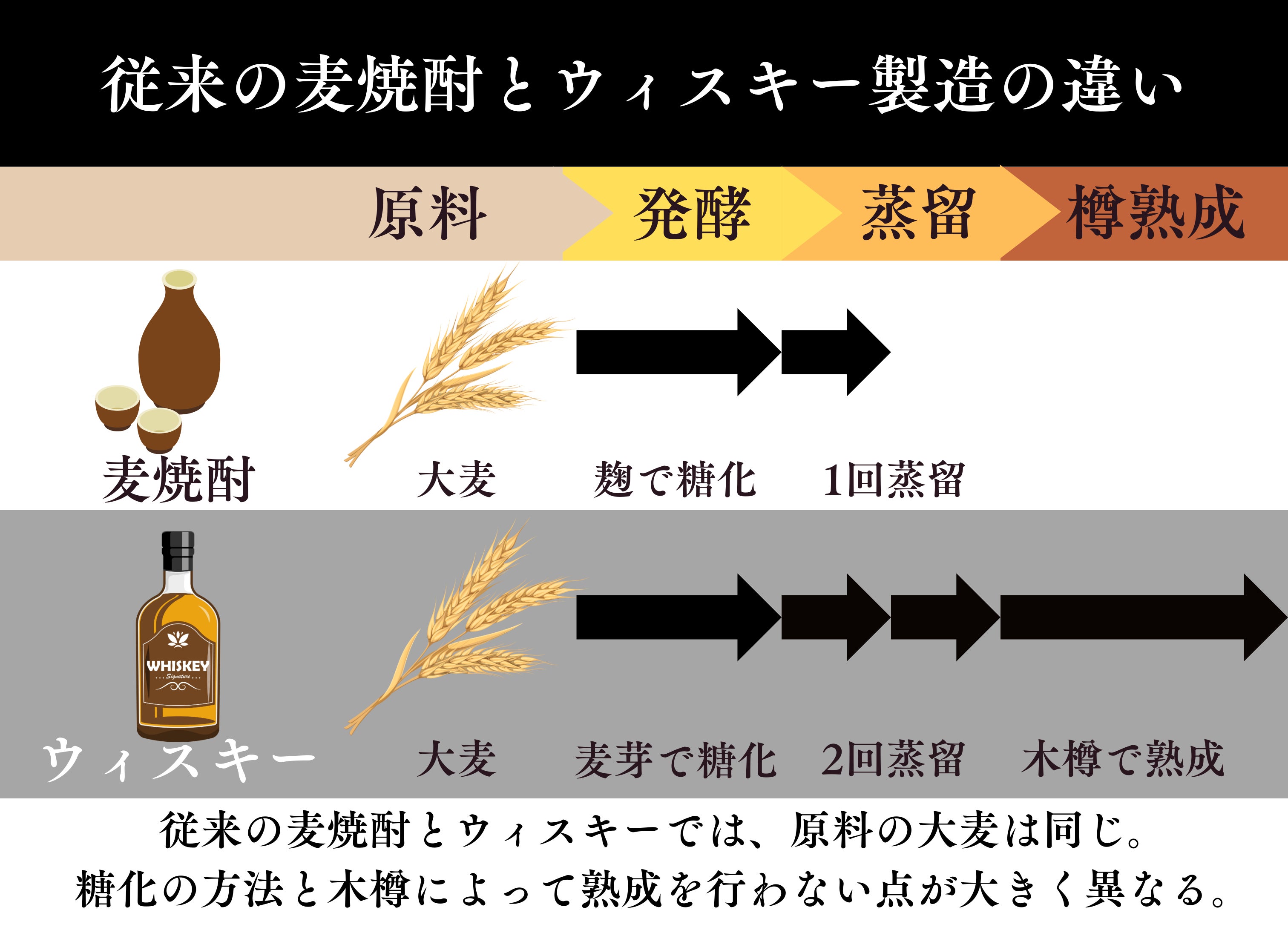 麦焼酎も、ウィスキーも原料である大麦は同じです(製品によっては他の穀物を使う場合も)。ウィスキーは麦の糖化に「麦芽」を使うのに対し、麦焼酎は「麹」を用いることで、日本ならではの繊細さと個性を持つお酒となります。ウィスキーは、海外が発祥のルーツに対して、麦焼酎は日本だからこそ生み出されたお酒だといえます。上の図では、一般的な違いを記載していますが、一般的な麦焼酎の工程では、木樽での熟成は行わないことが多いです。
