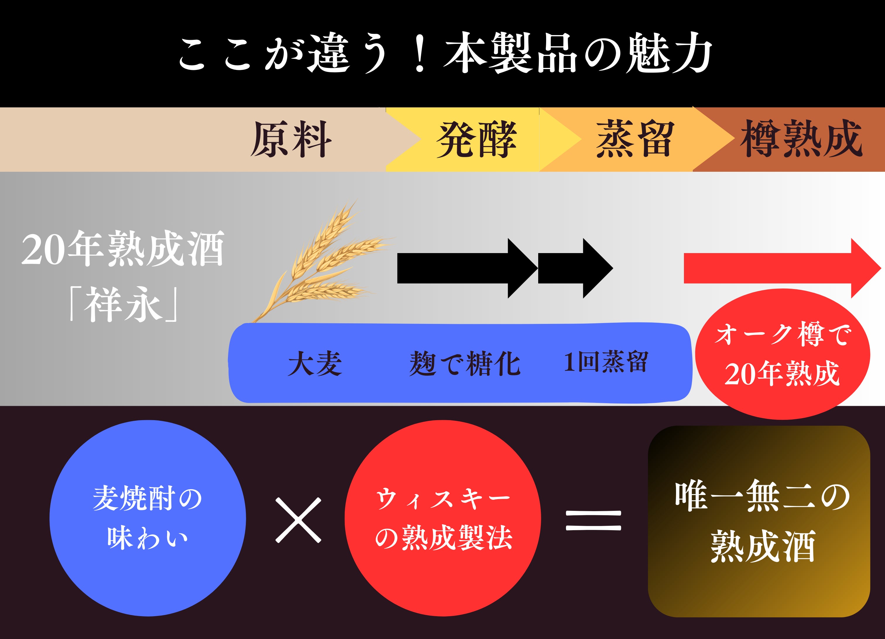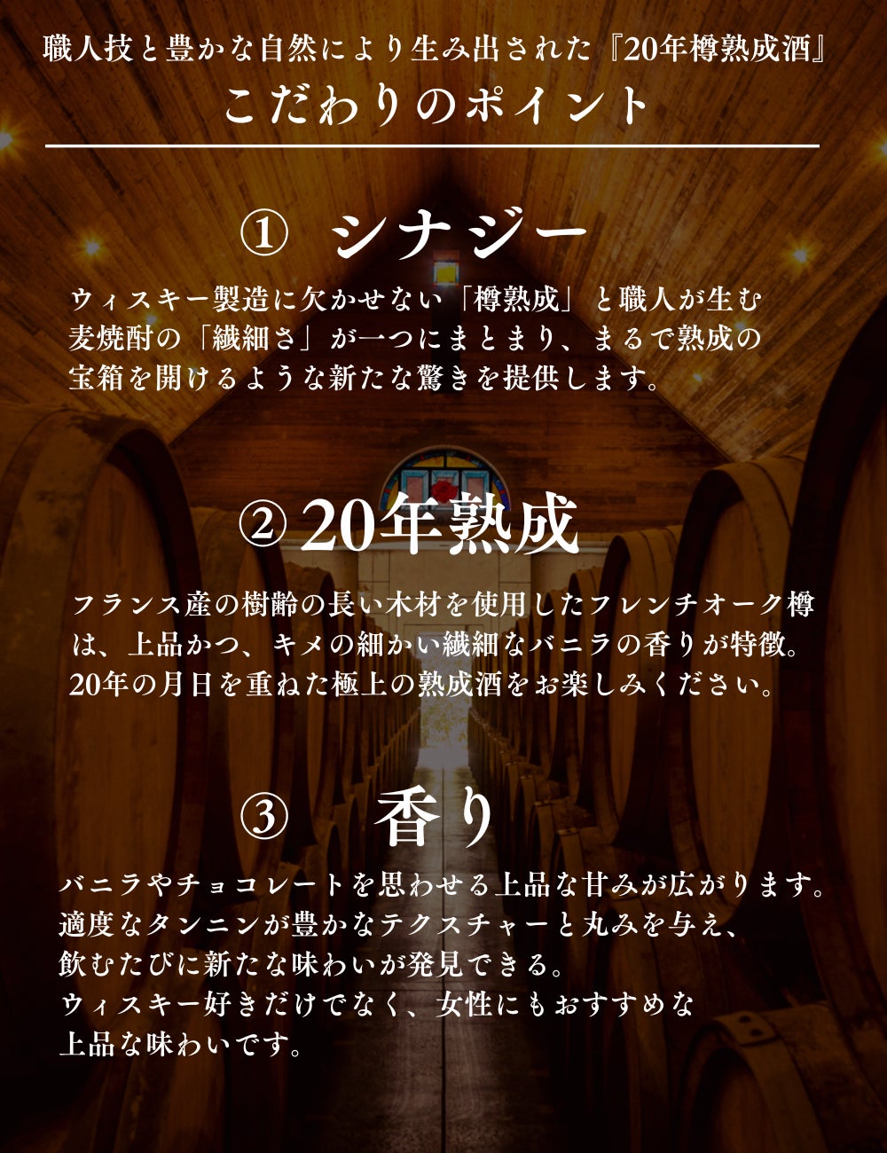 他のお酒との違いを作っているのは、以下の3ポイントです。酒造の個性とこだわり、そして20年の樽熟成がシナジーを生み出し、唯一無二の味わいを創り出しています。