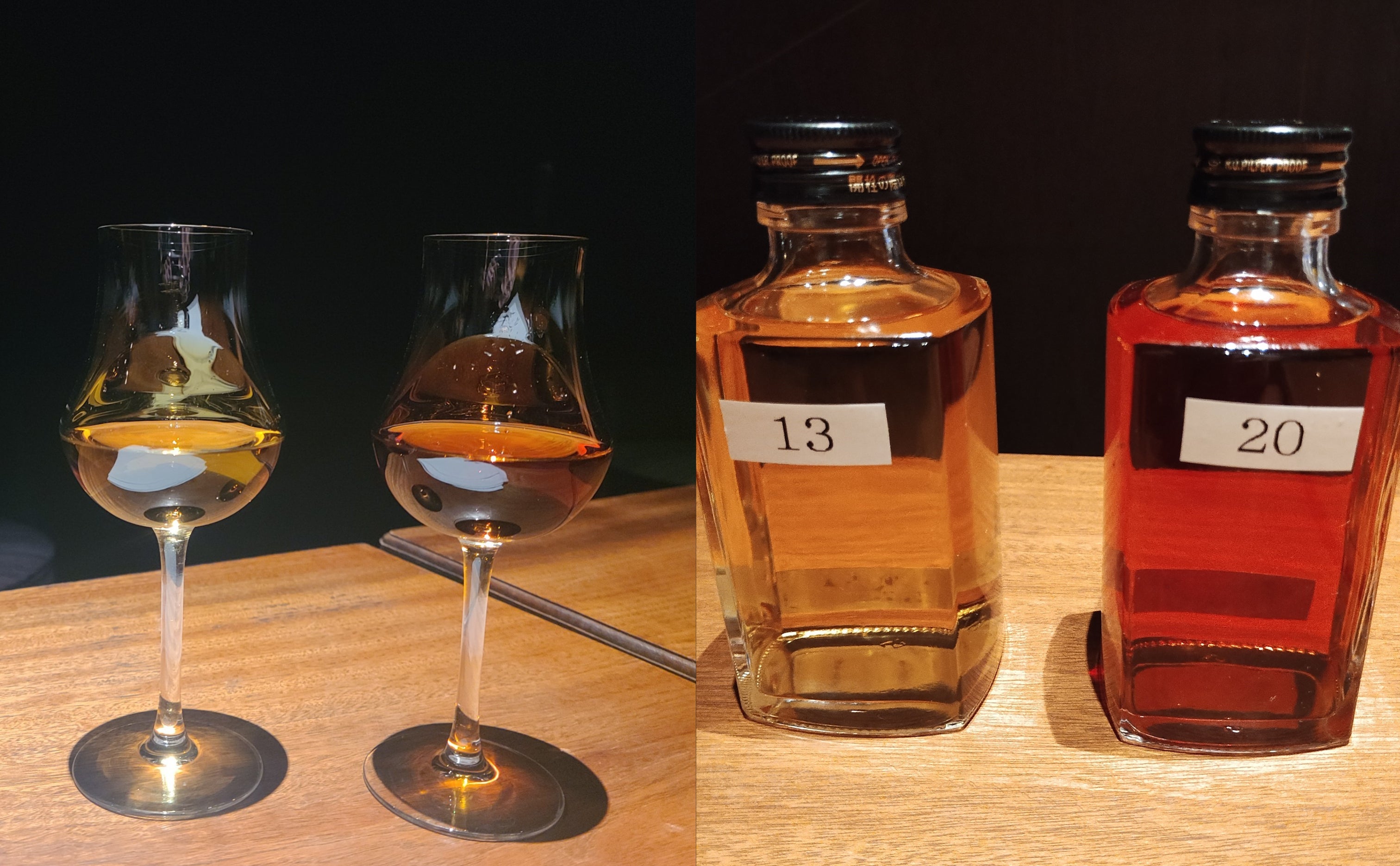※13年熟成酒と20年熟成酒の色合いの違い(グラス、瓶共に左:13年 右:20年)
