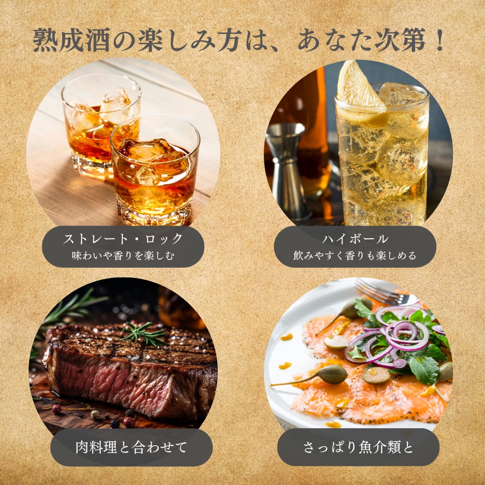 その味わいは、香り高い焼酎の味わいと、ウィスキーを代表とする蒸留酒貯蔵の定石とされている熟成の深みを併せ持つ逸品に仕上がっています。