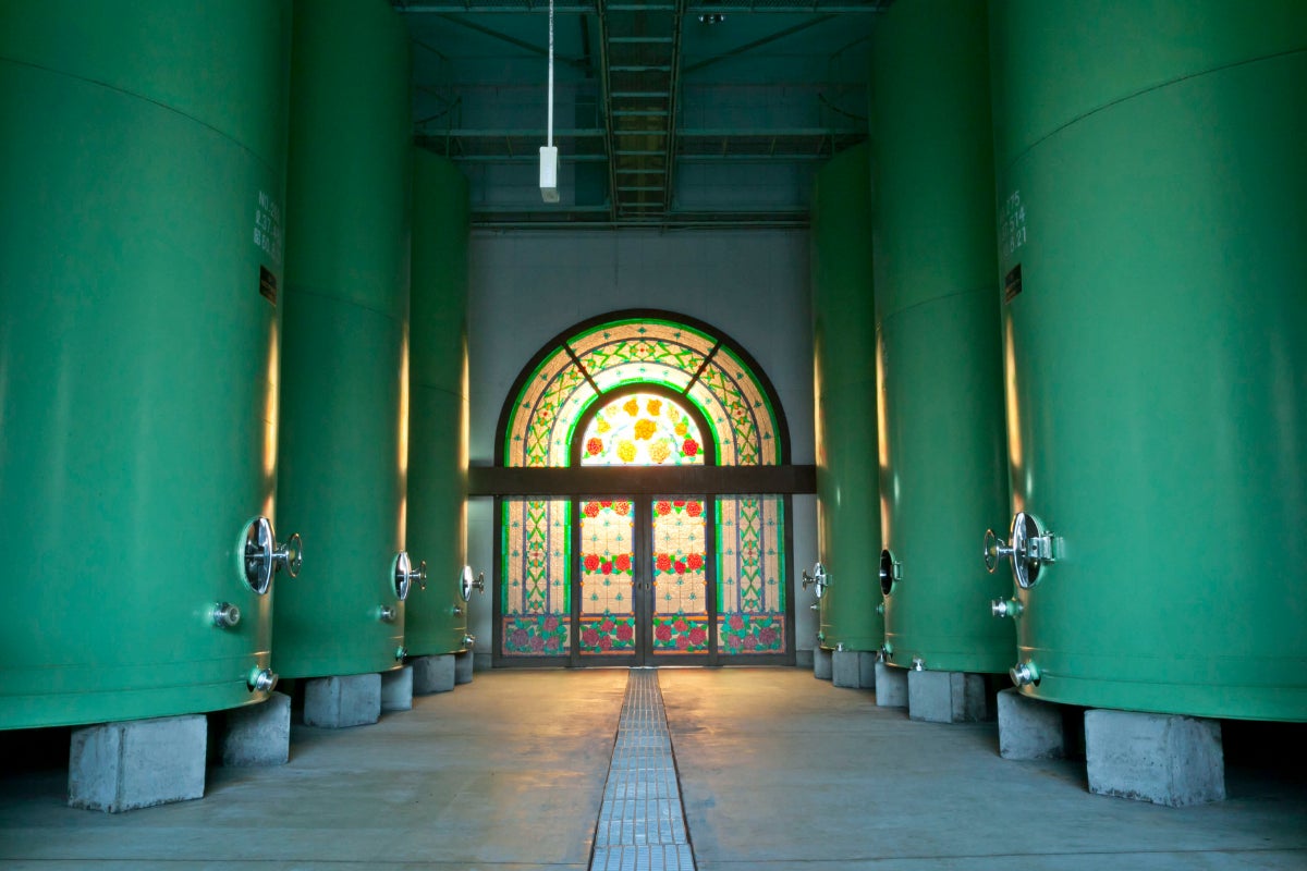 創業者が愛したバラの花が描かれた蔵前に並ぶタンク