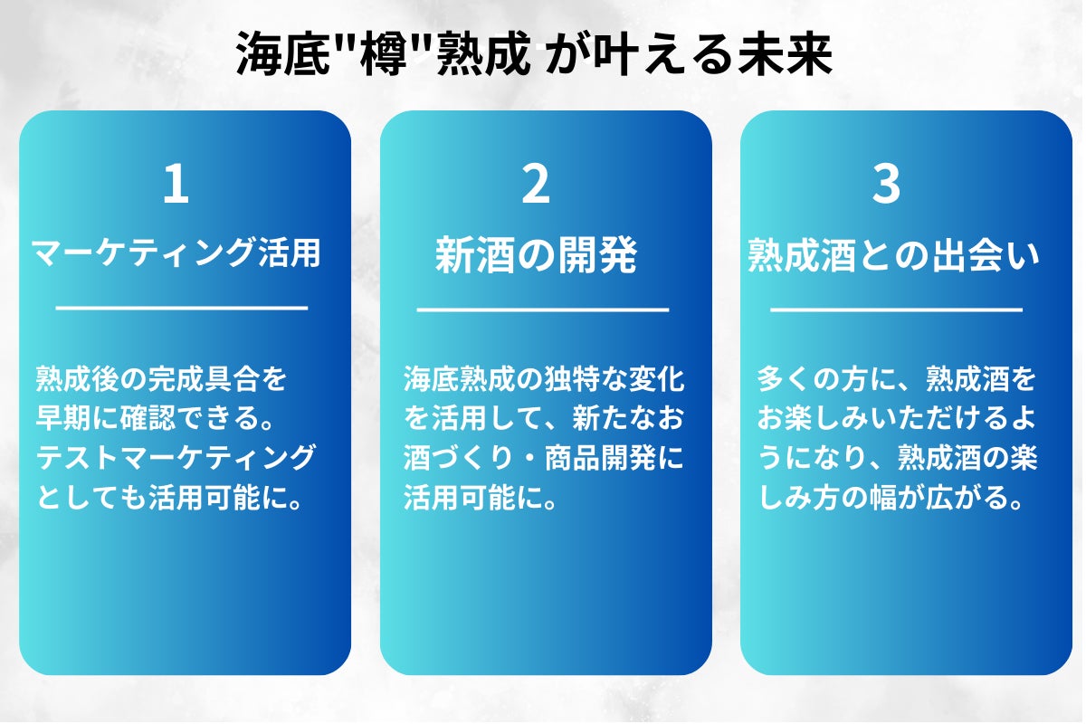 お酒づくり、熟成酒にはロマンと多くの造り手さん達の情熱と想いが詰まっています。海底での樽熟成が叶えば、もっと多くの人に熟成酒の魅力をお伝えできると考えています。