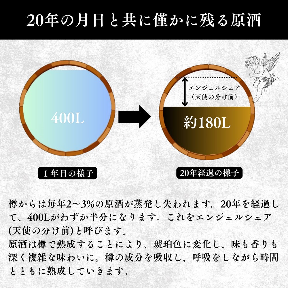 20年の樽熟成により、わずか半分になった原酒(180リットルの奇跡)を是非味わってください。