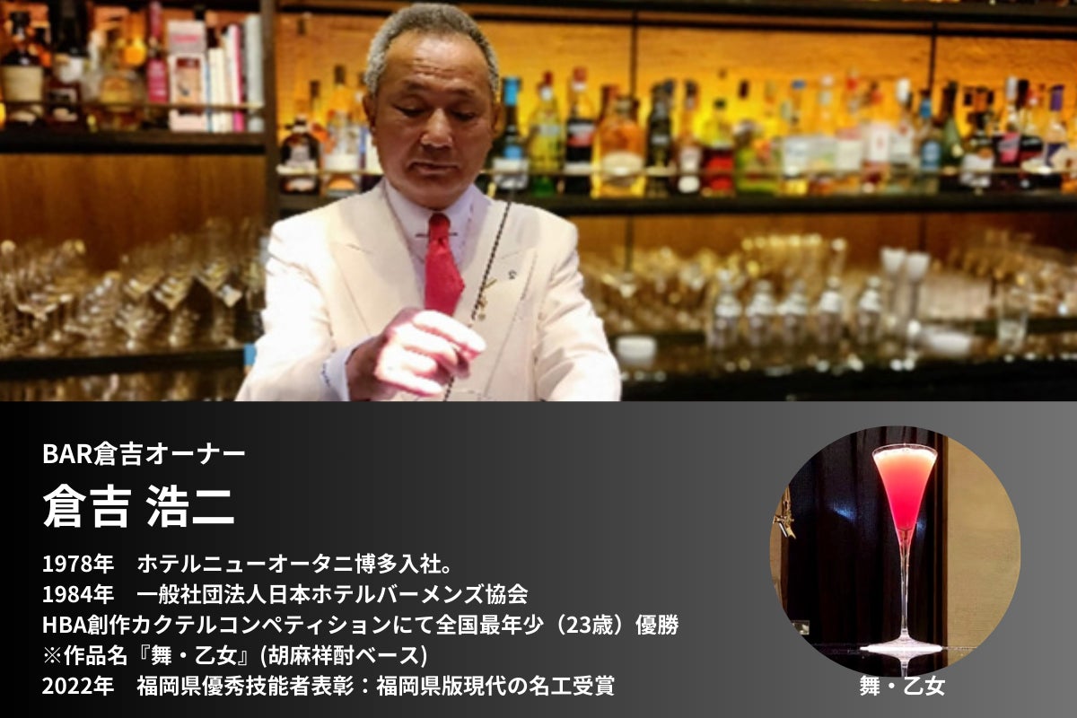 HBA全国大会で入賞した作品「舞・乙女」は、紅乙女酒造の創業者・林田春野さんが創り出した胡麻祥酎をベースとして作られたもの。皇太子殿下(現天皇陛下)のご要望にお応えして作られたというエピソードもあり、紅乙女酒造との縁も深い作品。現在は、バーの運営は後継者である増田氏に任せ、新鮮な魚を提供する居酒屋・昭和レトロ酒場の厨房にも立つ。