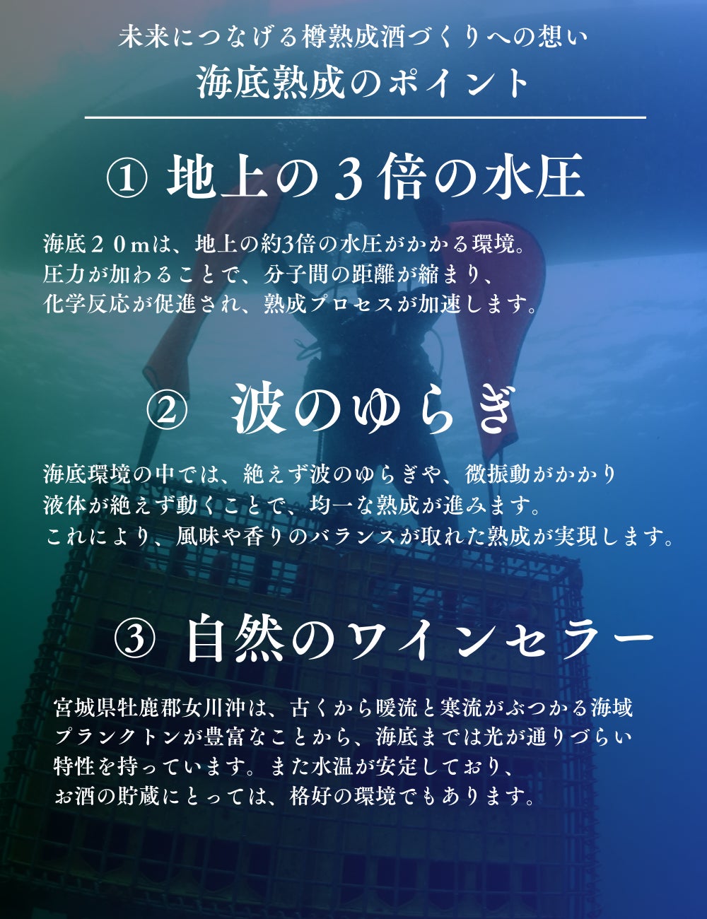 「熟成酒の味わいを、もっと身近に」をスローガンに掲げ、海底20mの環境下でワインやウィスキー、お酒の熟成を行っています(2018年12月設立)。