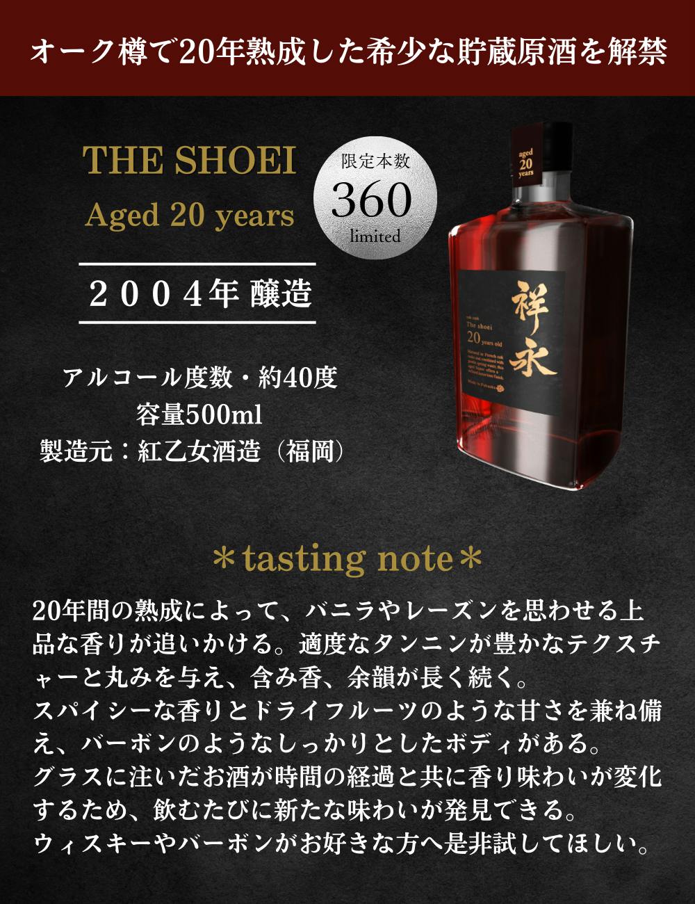 今回お届けする20年熟成酒は、2004年に産声をあげたお酒です。「二十歳を迎える成人祝い」「結婚記念日」「20周年記念の創立祝い」など、様々なシーンで喜ばれる特別な贈答品としてもご活用いただければ幸いです。
