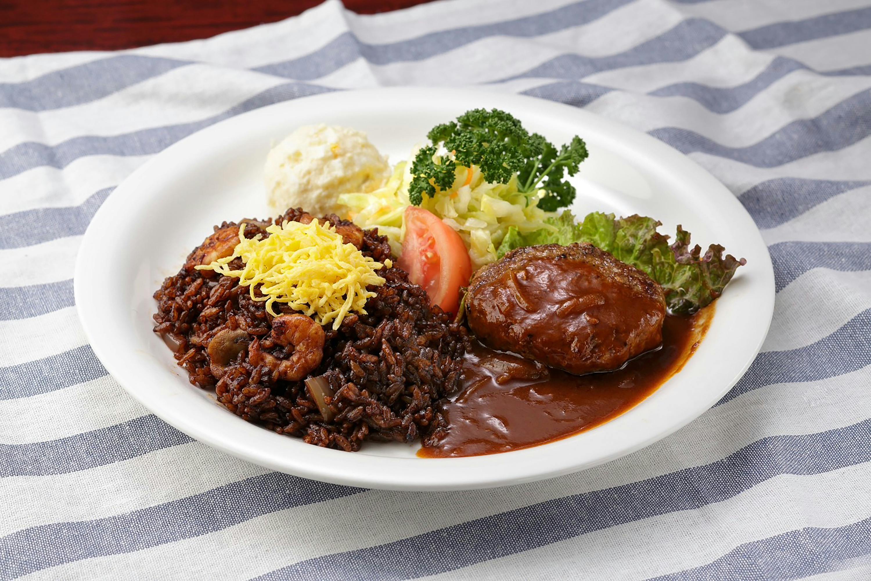 洋食の大人気アイテム・ハンバーグとえびめしを合わせたプレートになります。