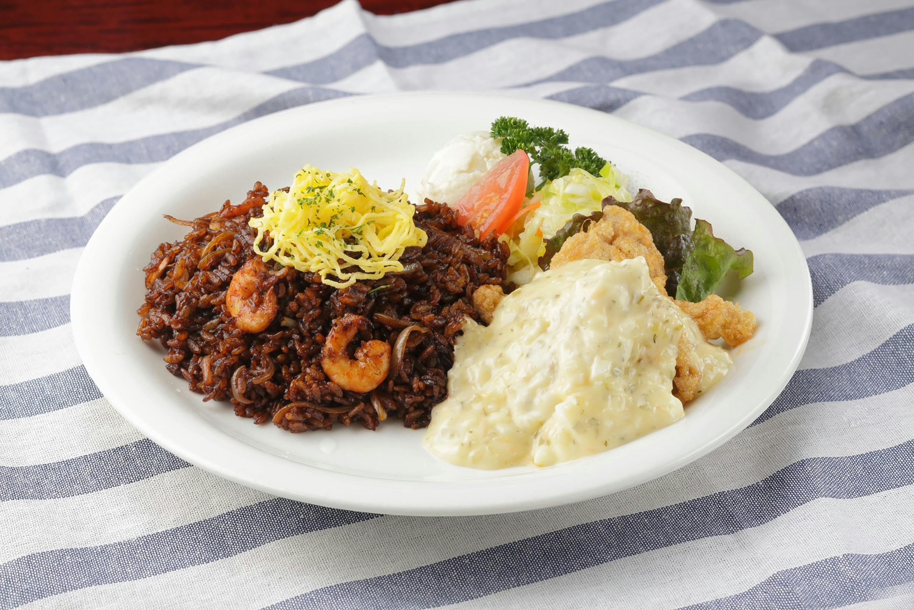 実は人気No.1のプレート。 チキン南蛮とえびめしを合わせたプレートになります。